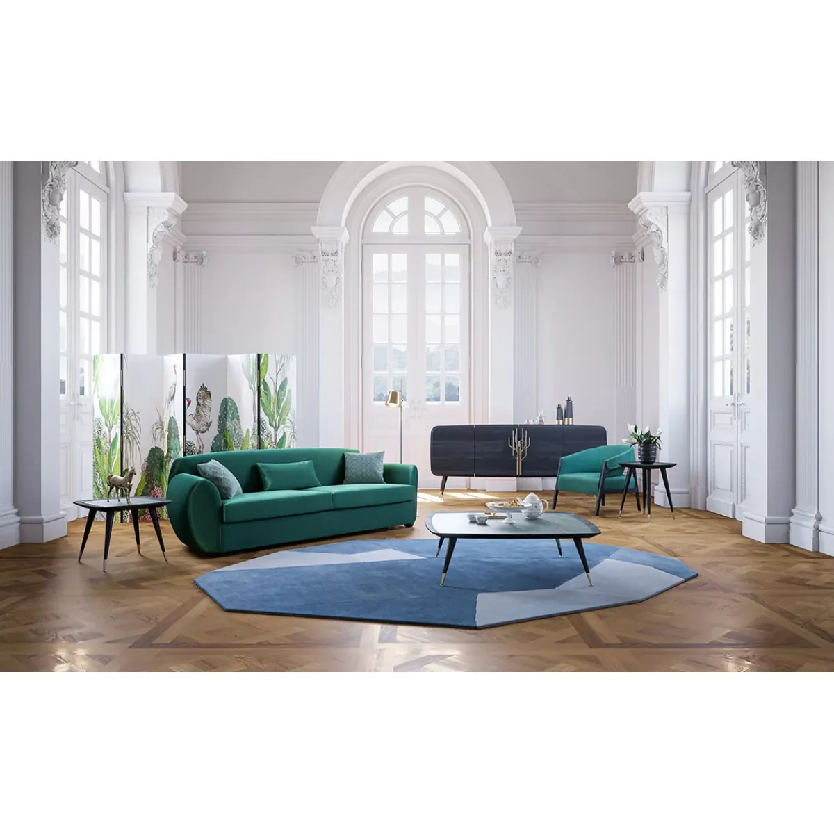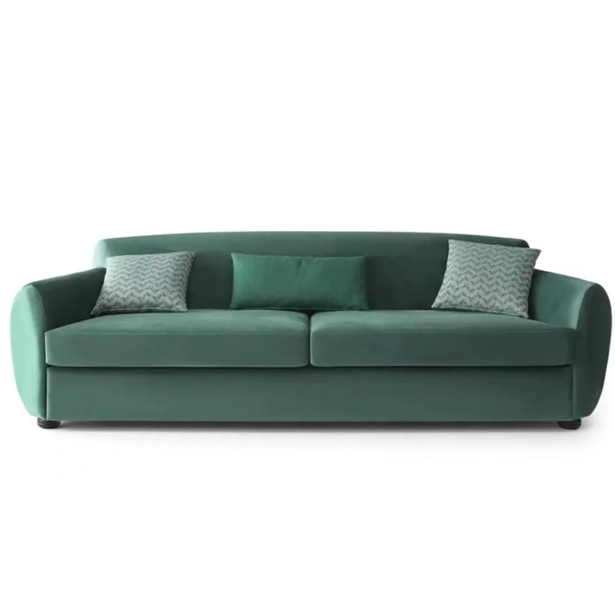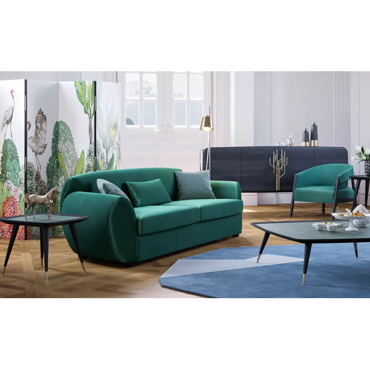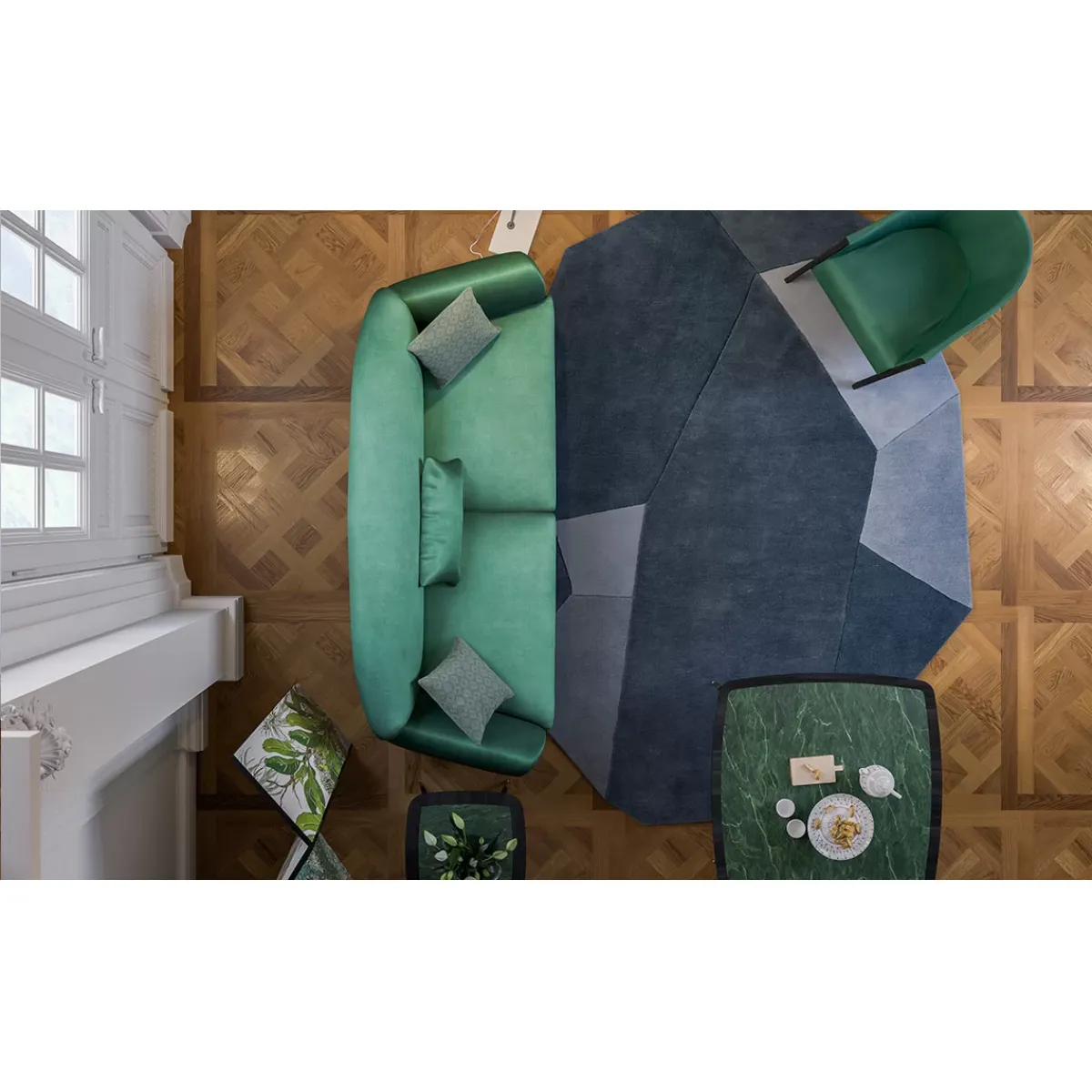 This luxury sofa stands out as a statement piece within modern interiors, balancing bold colour with understated elegance. The carefully curated palette of emerald green and soft neutral cushions reflects high-end European design trends. As a green upholstered sofa, it introduces depth and freshness into interiors, making it ideal for both contemporary homes and boutique hospitality settings. Its architectural curves and low-profile silhouette position it as a true modern luxury sofa, blending comfort with artistic form.