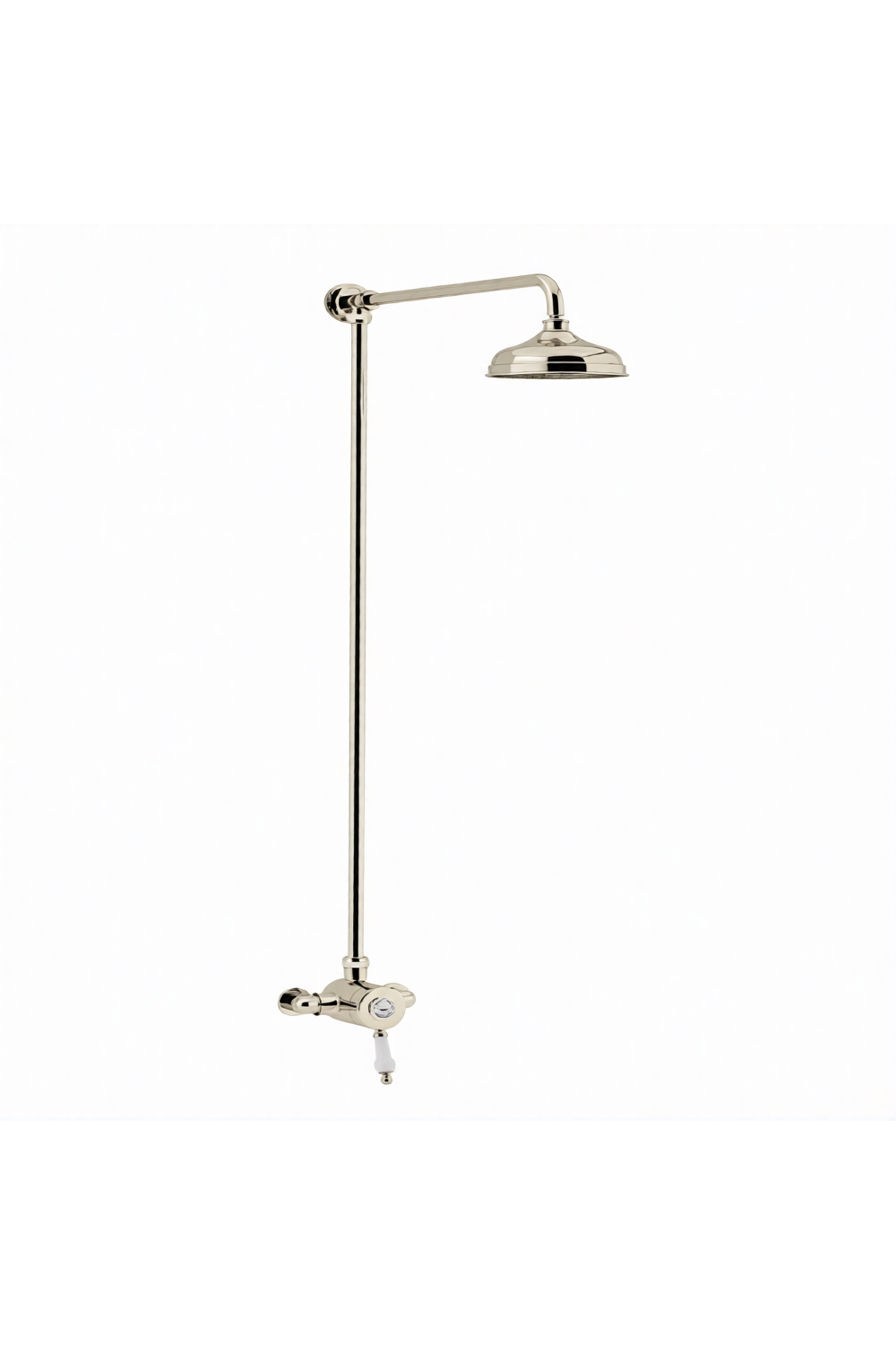 A high-end exposed thermostatic single control shower in vintage gold plated finish, featuring a fixed riser shower with a large 6” shower rose and premium handset. This system provides performance flow for a drenching shower experience and is perfect for creating luxury showers in modern bathrooms.