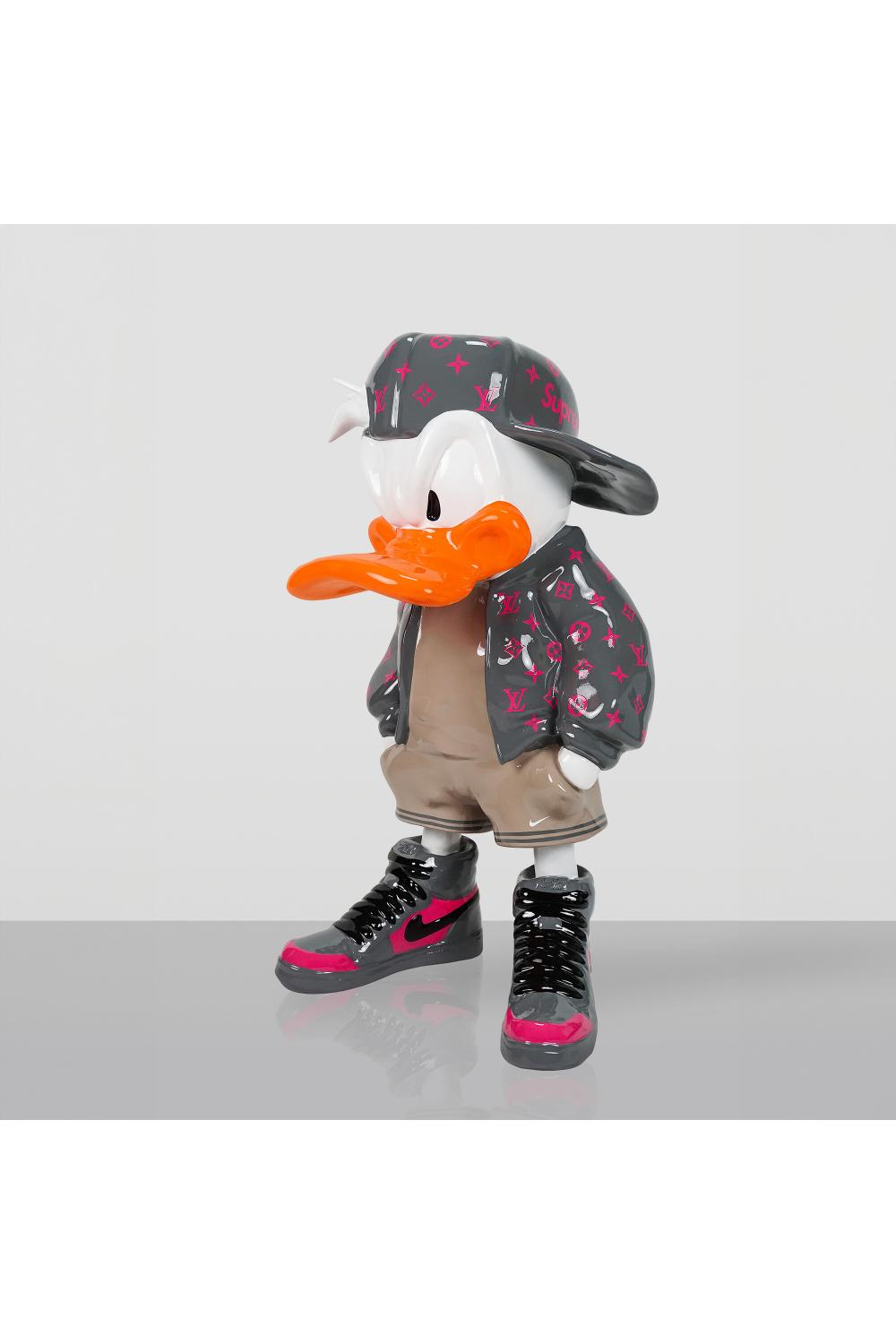 • Expressive duck-inspired figurative sculpture with street-style attitude