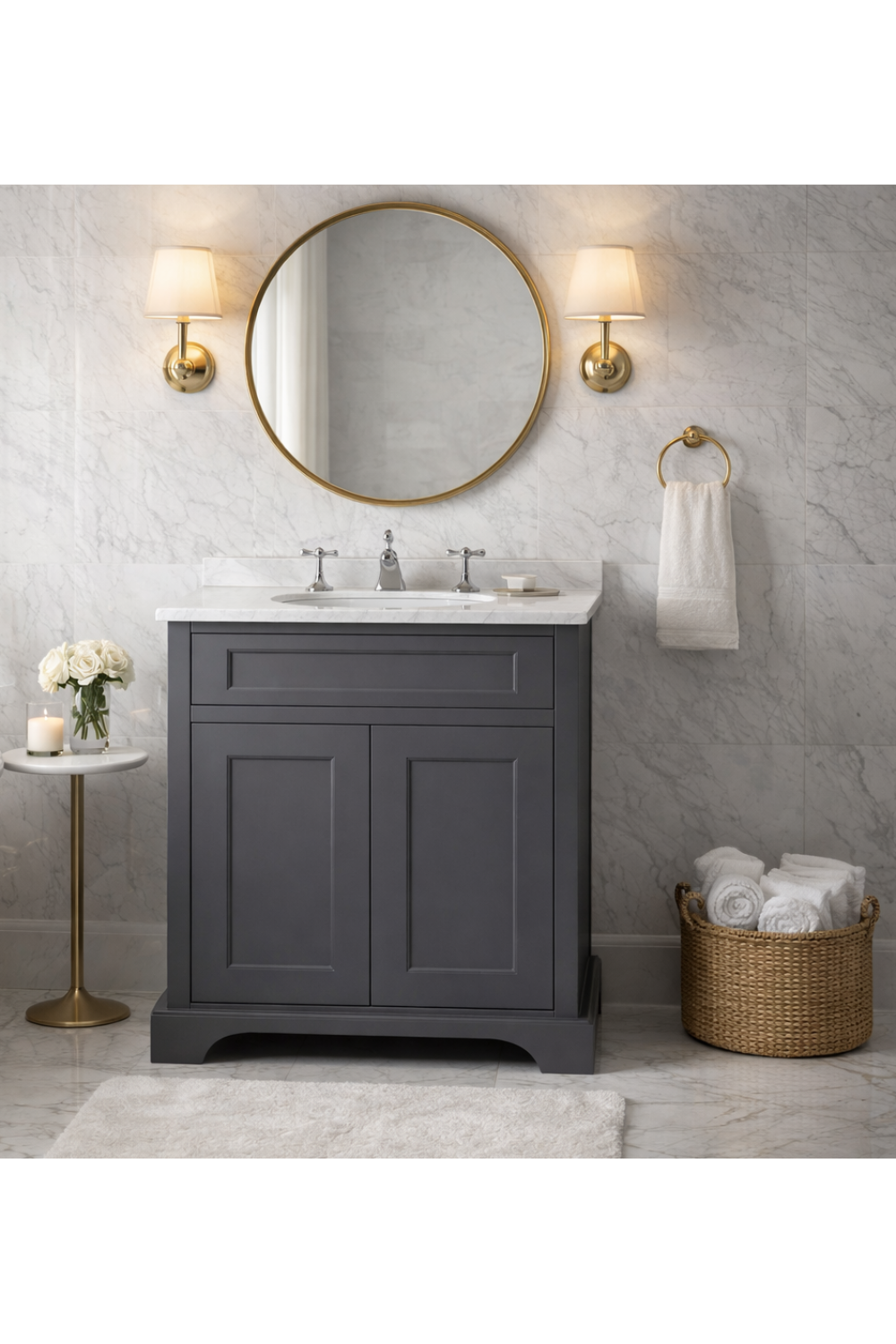 Luxury Freestanding Graphite Finish Vanity Unit with Single Drawer and Double Door Cabinet – 60 CM is designed to introduce architectural clarity and modern refinement into premium bathroom spaces. The Graphite finish offers a bold yet neutral presence, ideal for minimalist and classic interiors alike. The upper single drawer provides convenient access to everyday essentials, while the framed double door cabinet below conceals ample storage, ensuring a clean and organized bathroom environment. As a carefully proportioned designer vanity unit, it balances visual depth with practical functionality.