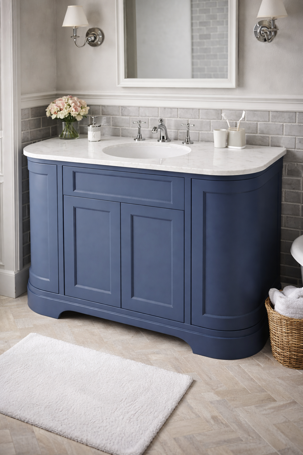Luxury Freestanding Maritime Blue Double Door Curved Vanity with White Stone Top – 120 CM is designed as a commanding center piece for expansive bathroom spaces. The deep Maritime Blue finish introduces richness and depth, while the softly curved front profile adds fluid elegance to the overall form. Topped with a smooth white stone surface, the vanity achieves a refined contrast that enhances its architectural presence. Behind the double doors, generous concealed storage supports everyday organization, making this sculptural designer vanity unit as practical as it is visually striking.