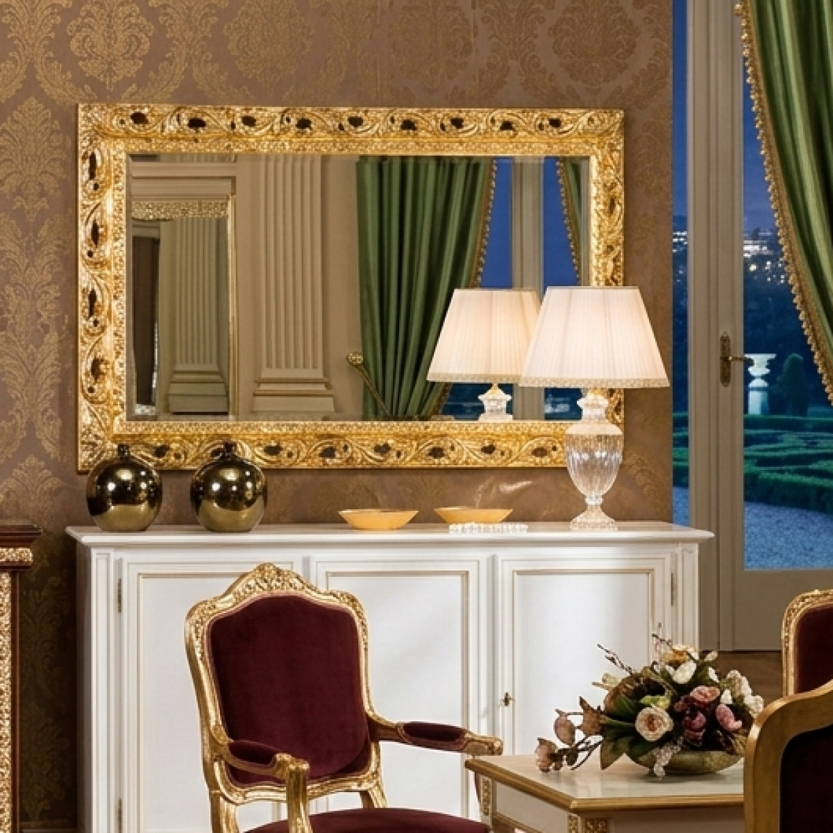A masterfully handcrafted statement from our collection of luxury baroque mirrors, this grand rectangular design embodies European opulence. Designed as one of the most refined luxury mirrors for living room, it enhances interiors with sculpted depth, luminous gold detailing, and timeless architectural elegance.
