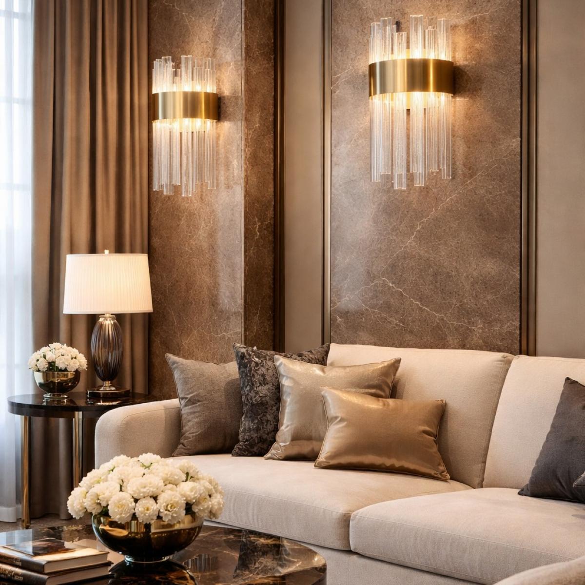 The Luxury Gold Finish Crystal Glass Rod Wall Lamp features stunning vertical crystal glass rods with a sleek gold metal frame. This luxury wall lamp creates a captivating light display, perfect for elevating luxury spaces like living rooms, dining areas, and hallways with a sophisticated, modern touch.