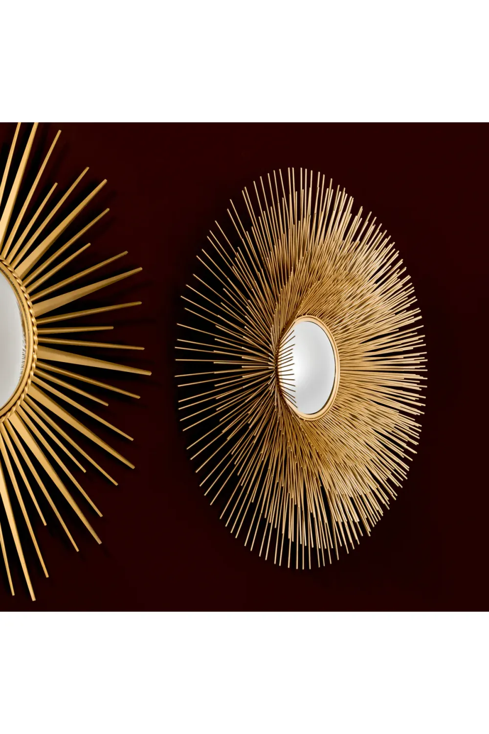 Perfect for hallways, grand living rooms, lounges, and boutique hotel interiors, this mirror becomes an immediate focal point wherever it is placed. The convex center expands visual depth, while the radiant frame captures and reflects light beautifully—an elegant choice for homeowners seeking the warmth of a gold finish mirror or the expressive silhouette of a solar convex mirror. Its glowing metallic tones make it ideal for walls needing a distinguished decorative feature.