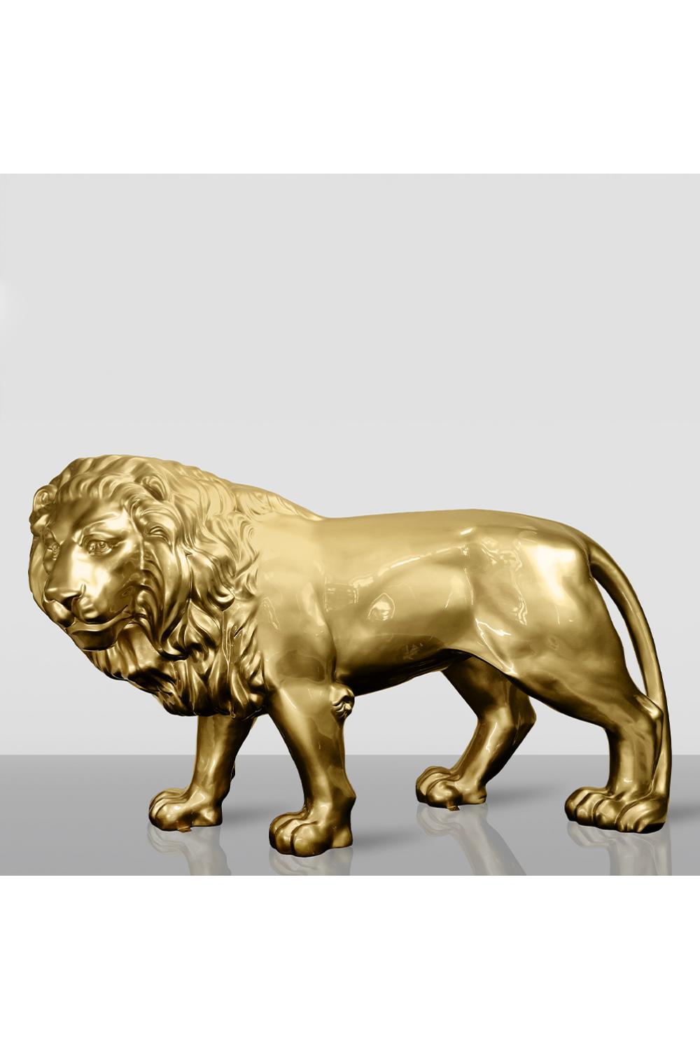 A symbol of strength and prestige, this life-size lion sculpture is designed to transform any room into a statement of luxury. The golden finish enhances its sculptural form, capturing light with a beautiful metallic radiance that instantly draws attention. Its poised, forward-facing stance conveys dignity and power, making it an exceptional centerpiece for refined interiors.