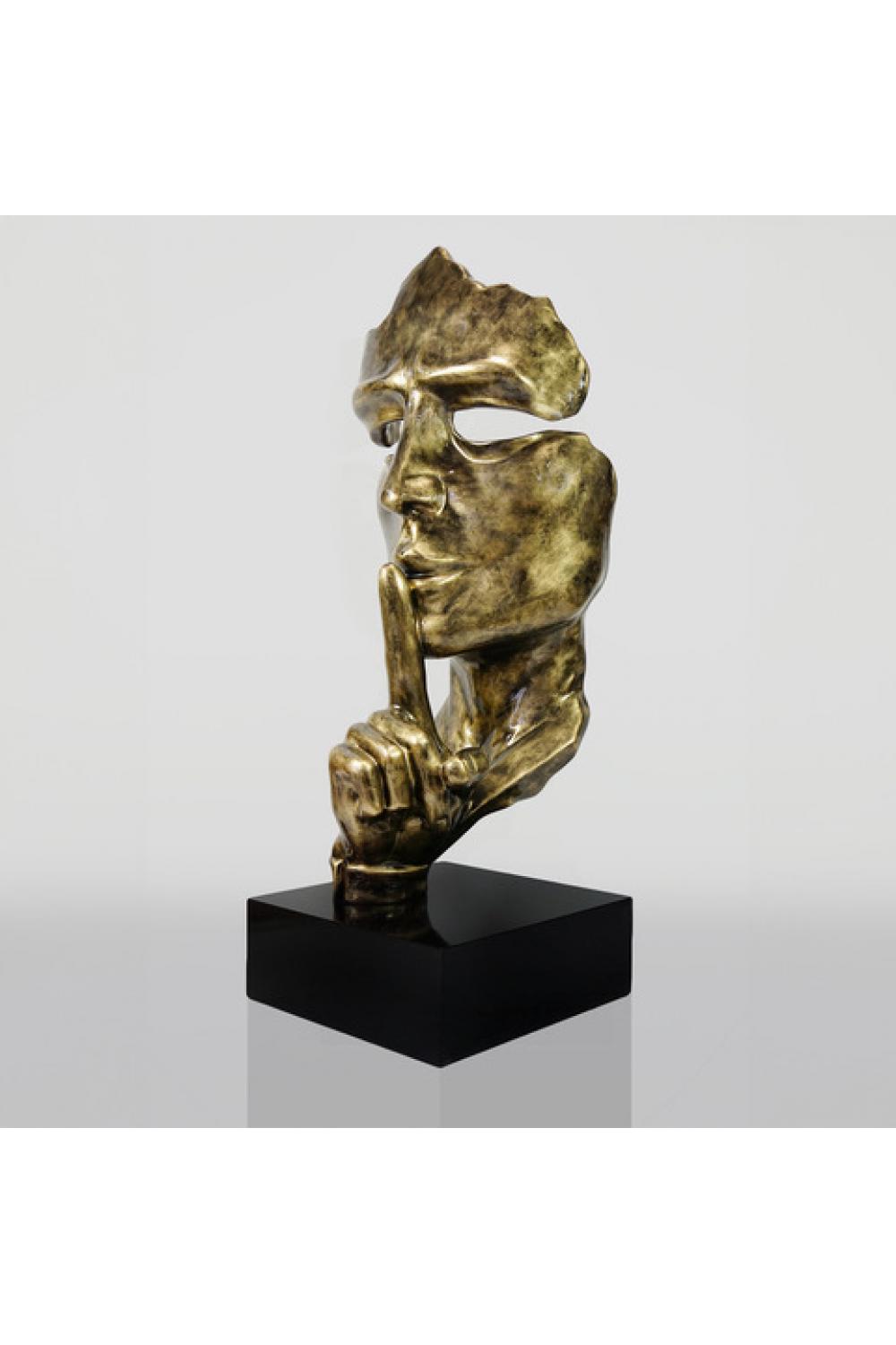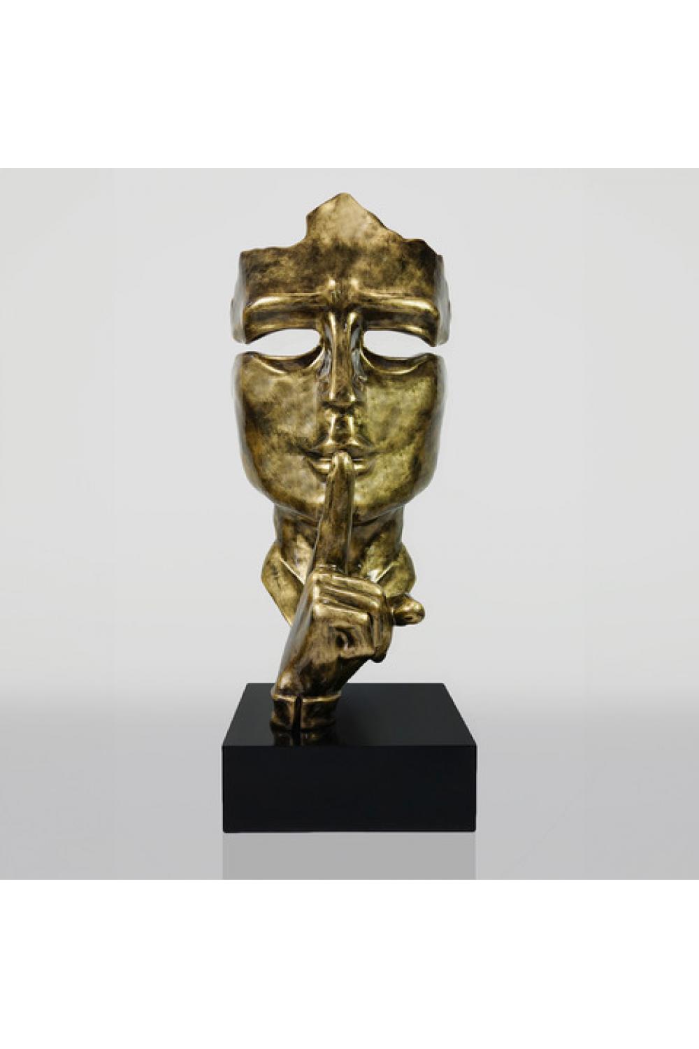 Designed to elevate any architectural space, this life-size mask sculpture blends expressive modern artistry with timeless metallic refinement. The gold patina finish offers a rich, aged-metal character, giving the sculpture a warm, luxurious glow that instantly captures attention. Its flowing contours and signature silence gesture create a dramatic yet serene visual impact, making it a powerful artistic centerpiece.