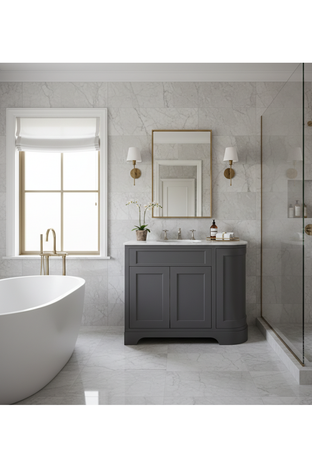 Sleek and architectural, this double door vanity unit features a refined left-hand curved profile, sophisticated Graphite finish, and a smooth white stone top. Designed as a premium designer vanity unit, it offers balanced storage and understated elegance for modern luxury vanities for bathroom interiors.