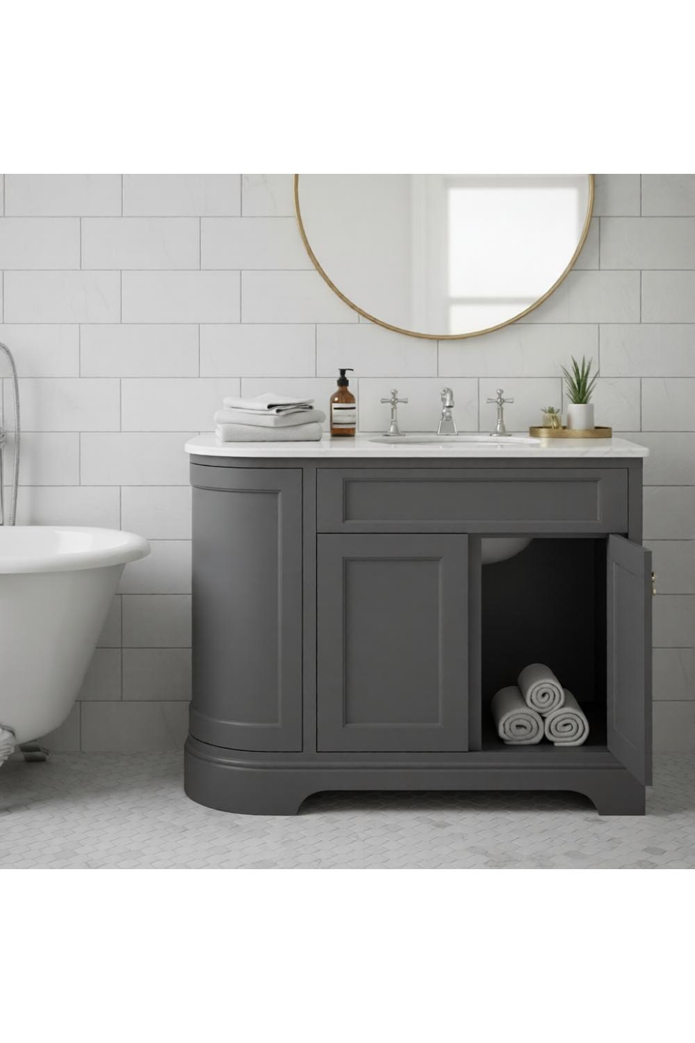 This refined double door vanity unit features a sculpted right-hand curved cabinet, deep Graphite finish, and an elegant white stone top, offering generous concealed storage and architectural presence as a premium designer vanity unit for sophisticated European bathrooms.