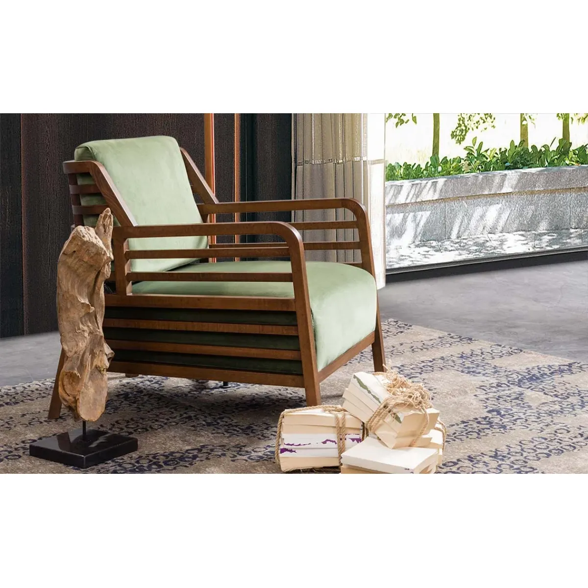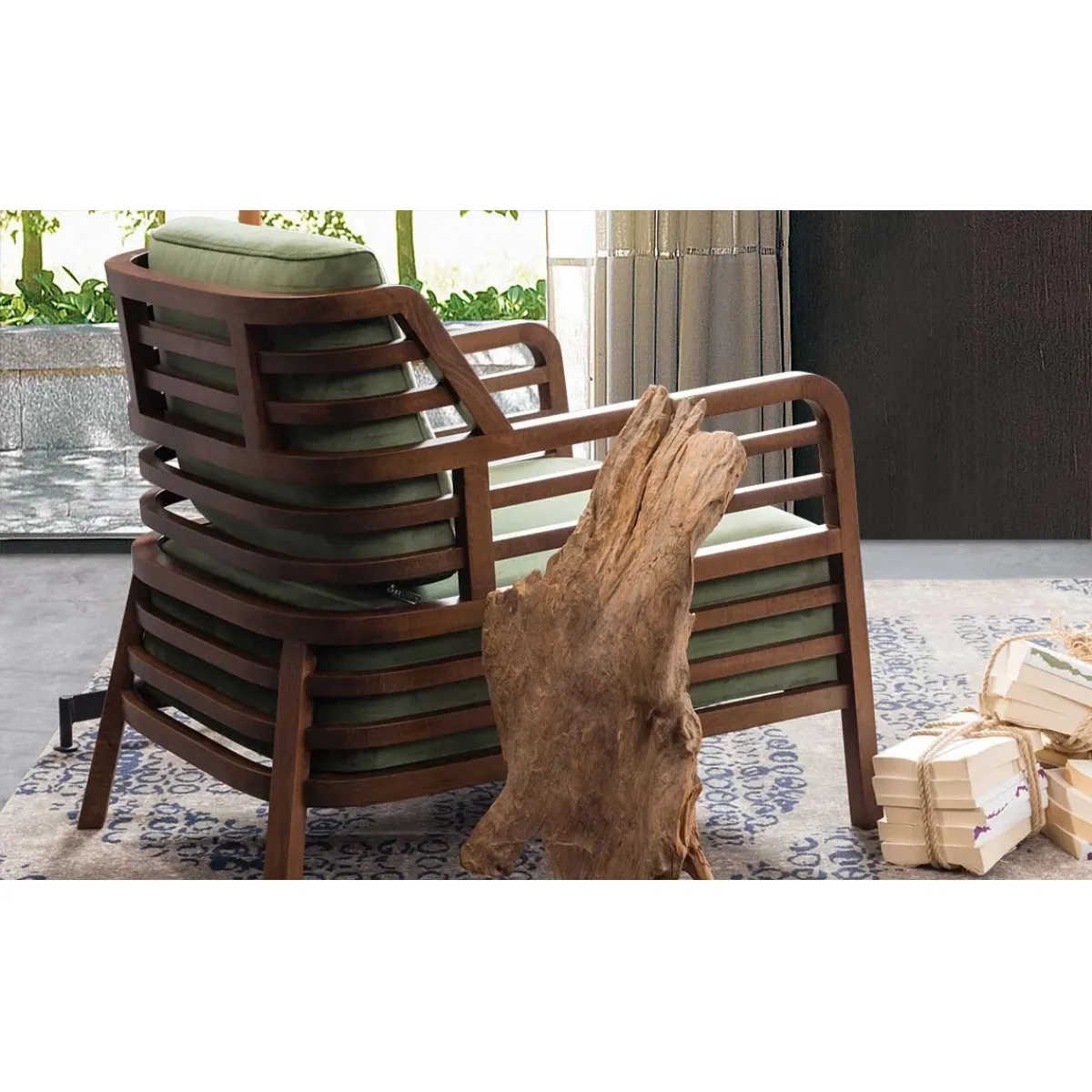 • Luxury wooden lounge armchair crafted with premium upholstery and ergonomic cushioning
