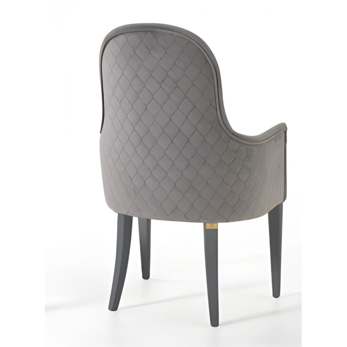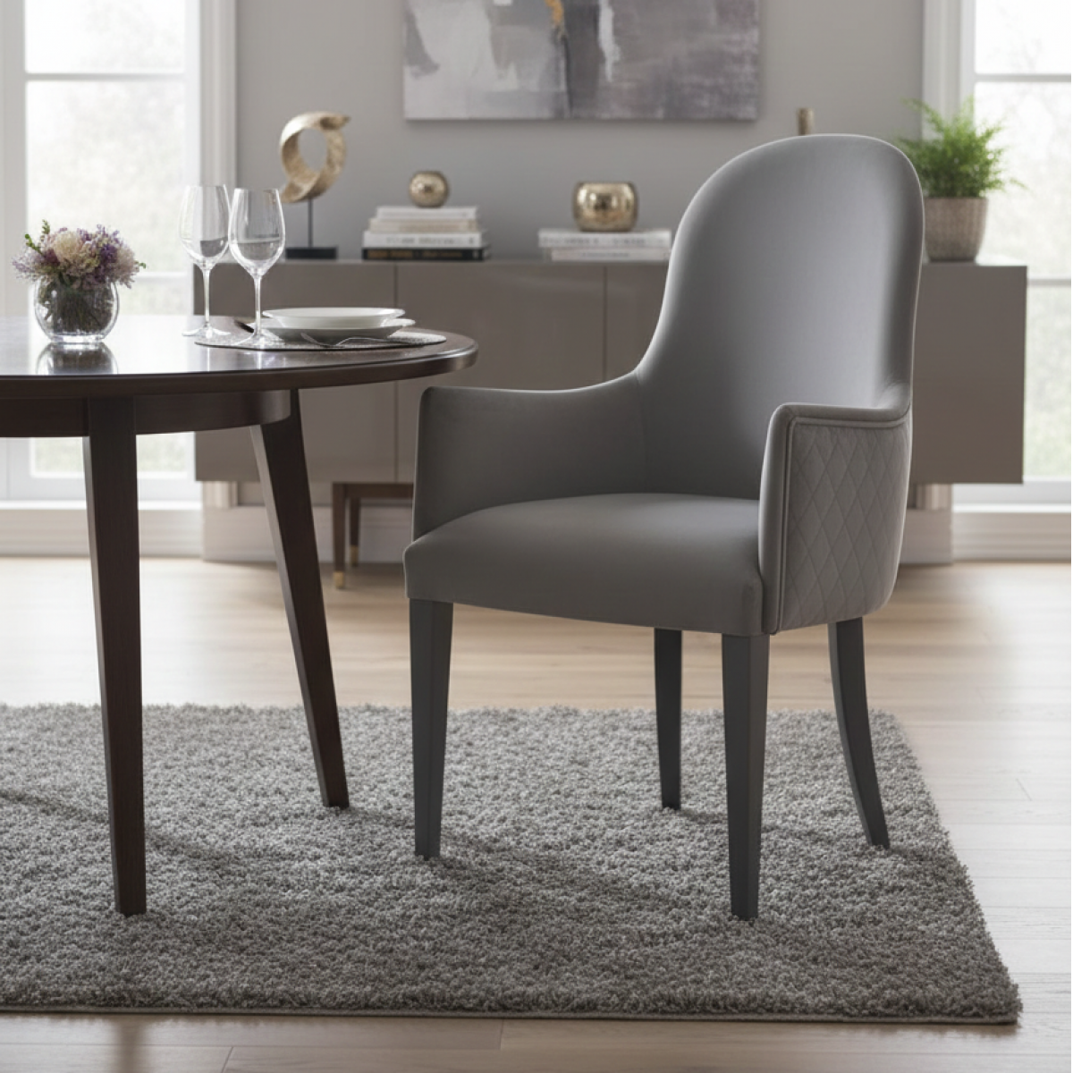 Elegant luxury upholstered dining armchair crafted in refined grey velvet with a sculpted oval back and diamond quilting. Designed as sophisticated luxury chairs for dining room, this contemporary piece blends European craftsmanship, ergonomic comfort, and architectural elegance.