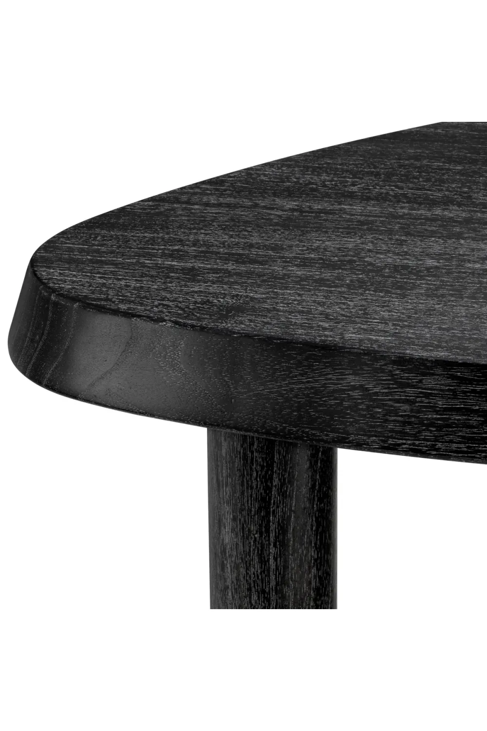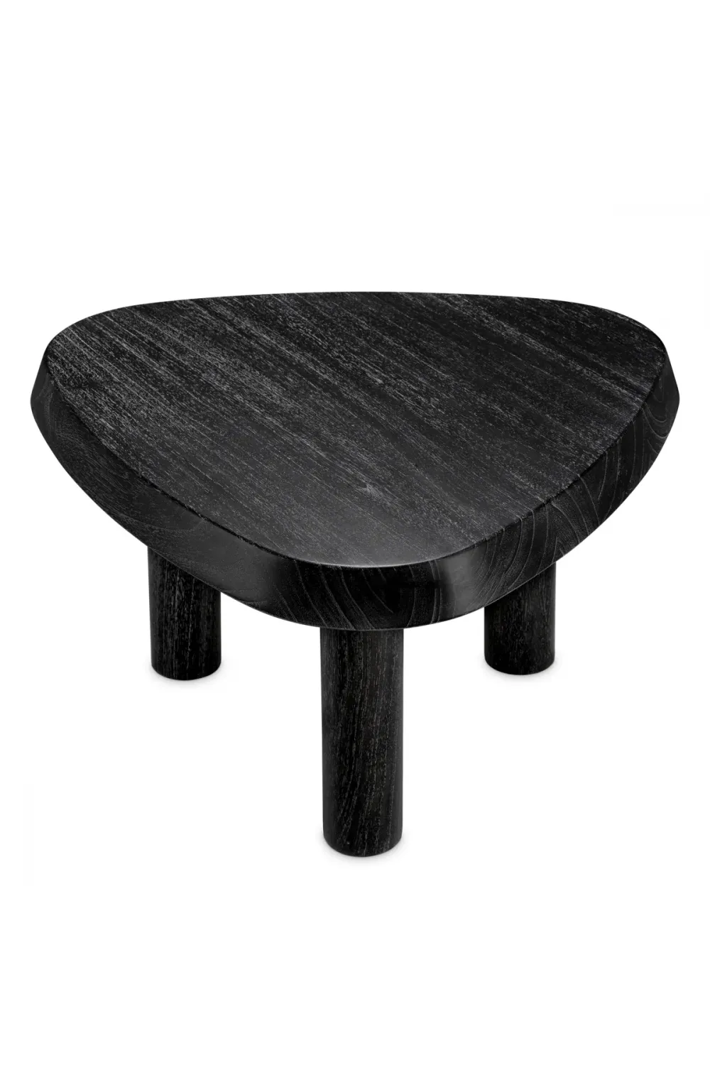 The design is anchored by three sturdy legs, providing exceptional stability while maintaining a light and elegant visual presence. Crafted as a premium wooden coffee table, it combines durability with refined aesthetics. The gently contoured pebble shaped table top features a carefully finished curved corner profile and soft edges, offering both comfort and safety. Its dark veneer tone allows it to function beautifully as a modern black coffee table, while the organic shape elevates it to a true designer coffee table for luxury interiors.