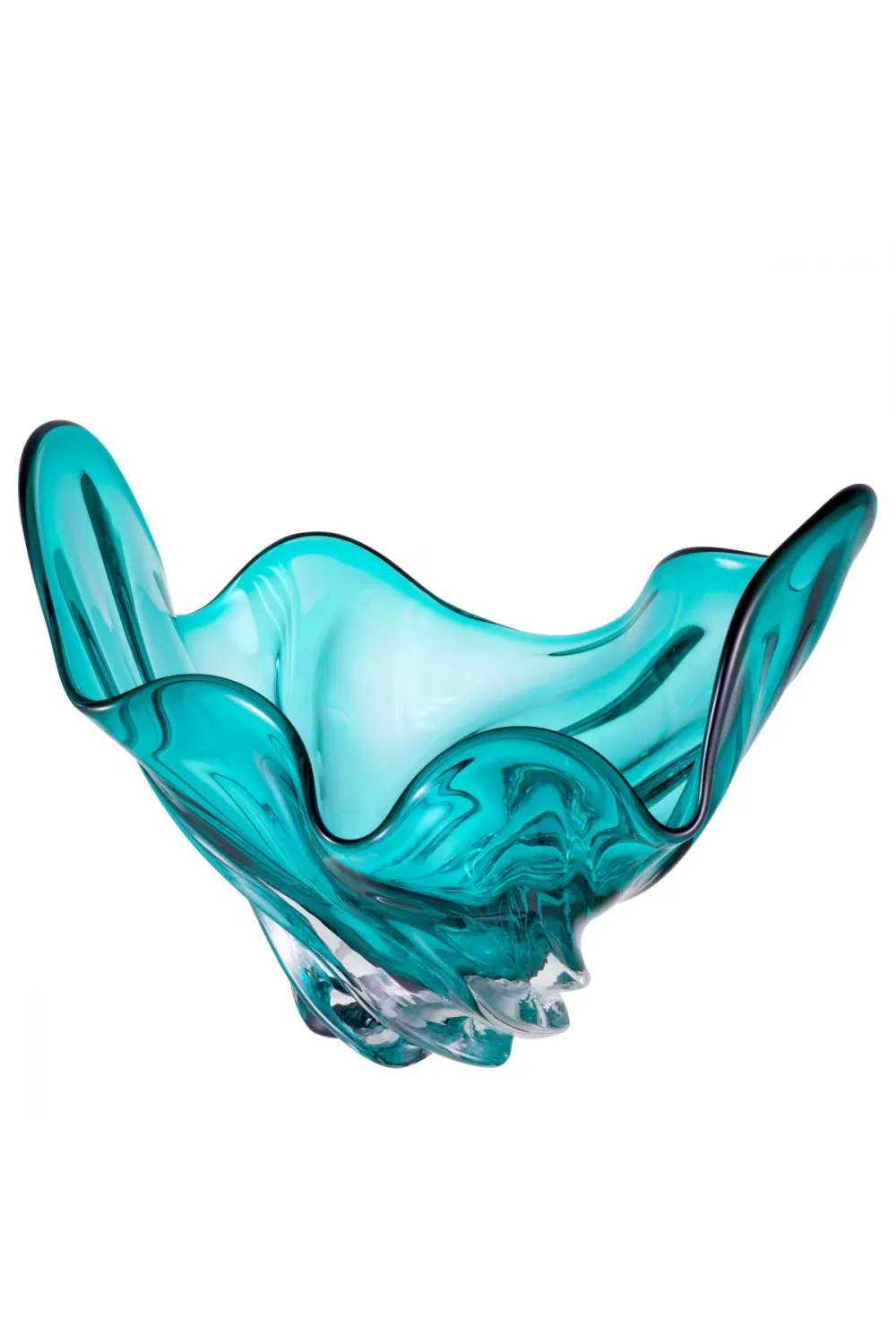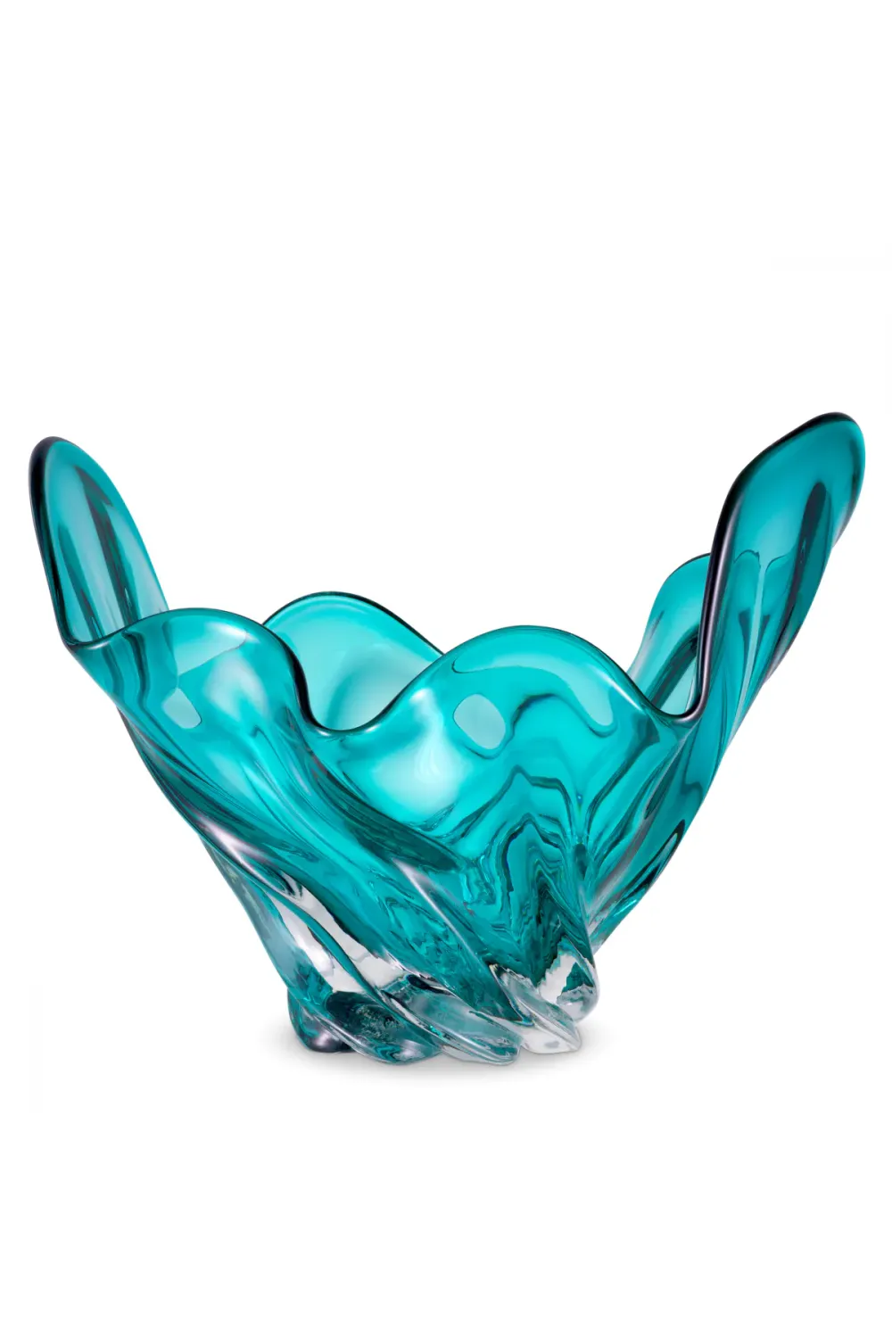 The bowl’s energetic contours and fluid detailing infuse interiors with a lively, expressive spirit, while the luminous green glass captures and reflects light beautifully. Whether styled as a statement centerpiece, placed on a console table, or used as a decorative accent in a curated vignette, this bowl brings a bold yet elegant visual appeal.