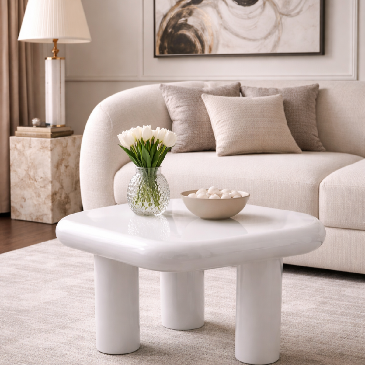 The Luxury High Gloss White small Side Table showcases a sculptural free-form design with a radiant lacquered finish and cylindrical pedestal legs. This refined luxury side table blends minimalist elegance with contemporary European sophistication, perfect for modern bedrooms and stylish living spaces.Exclusively curated by Luxury Group International.