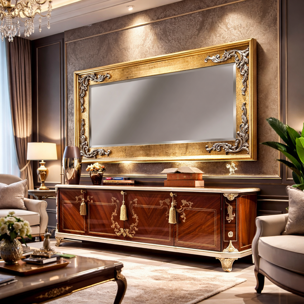 An opulent center piece from our refined collection of luxury baroque mirrors, this gold and silver handcrafted design enhances luxury mirrors for living room interiors with sculpted detailing and grand European presence.