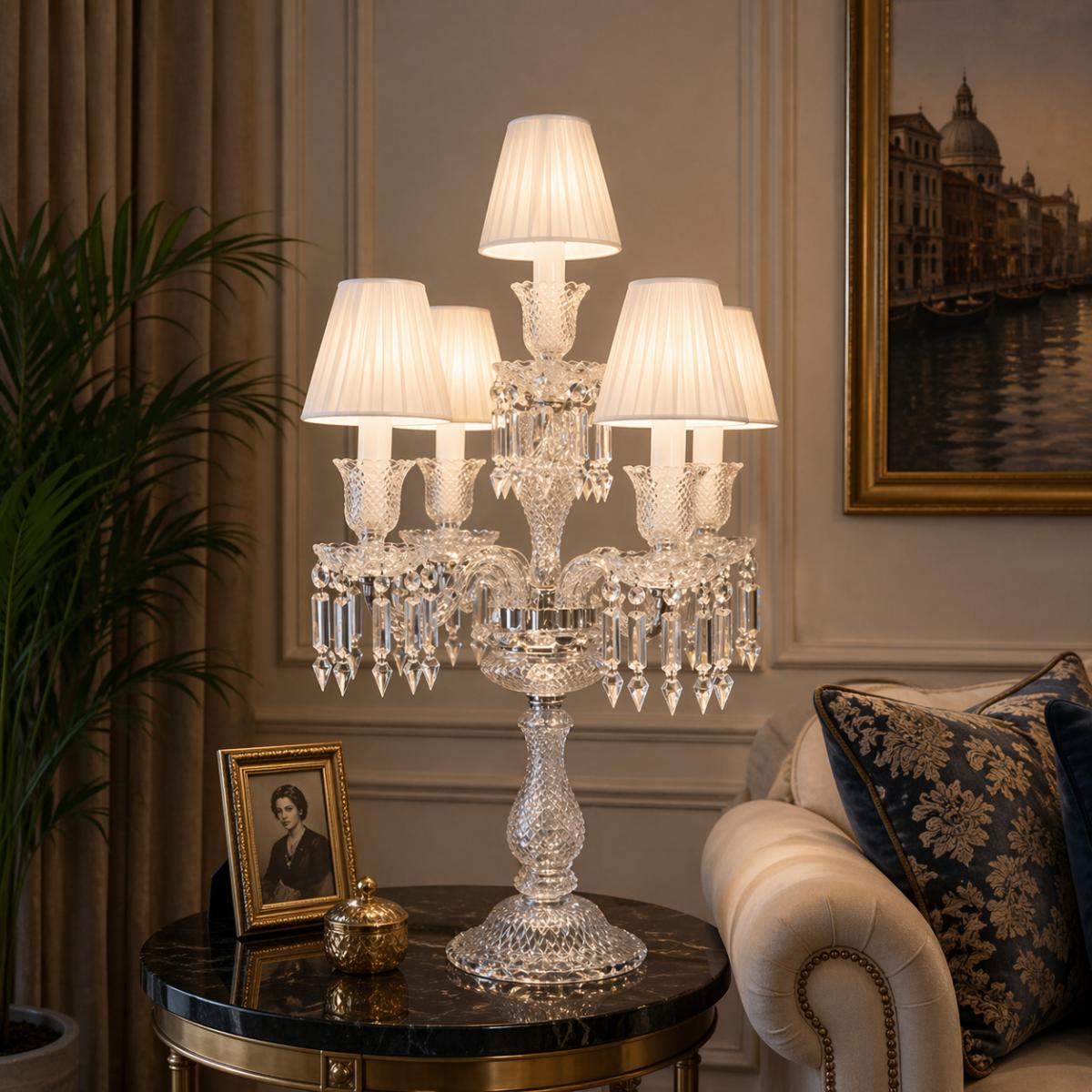 At the heart of the design is the standout crystal-and-shade arrangement: a luxurious crystal body topped to create the signature 6 light shade effect. Clear, faceted crystal elements form the decorative structure, while the metallic base supports the lamp with a polished, reflective presence. The visual impact is further amplified by the structured lamp shade look, creating a dramatic glow pattern when lit. This crystal table lamp aesthetic blends ornate detailing with a clean, elegant color direction—white and clear—so it harmonizes easily with both modern glamour and traditional styling. Discover our luxury lighting collections to find statement pieces that elevate ambiance and bring a touch of timeless elegance to every interior.