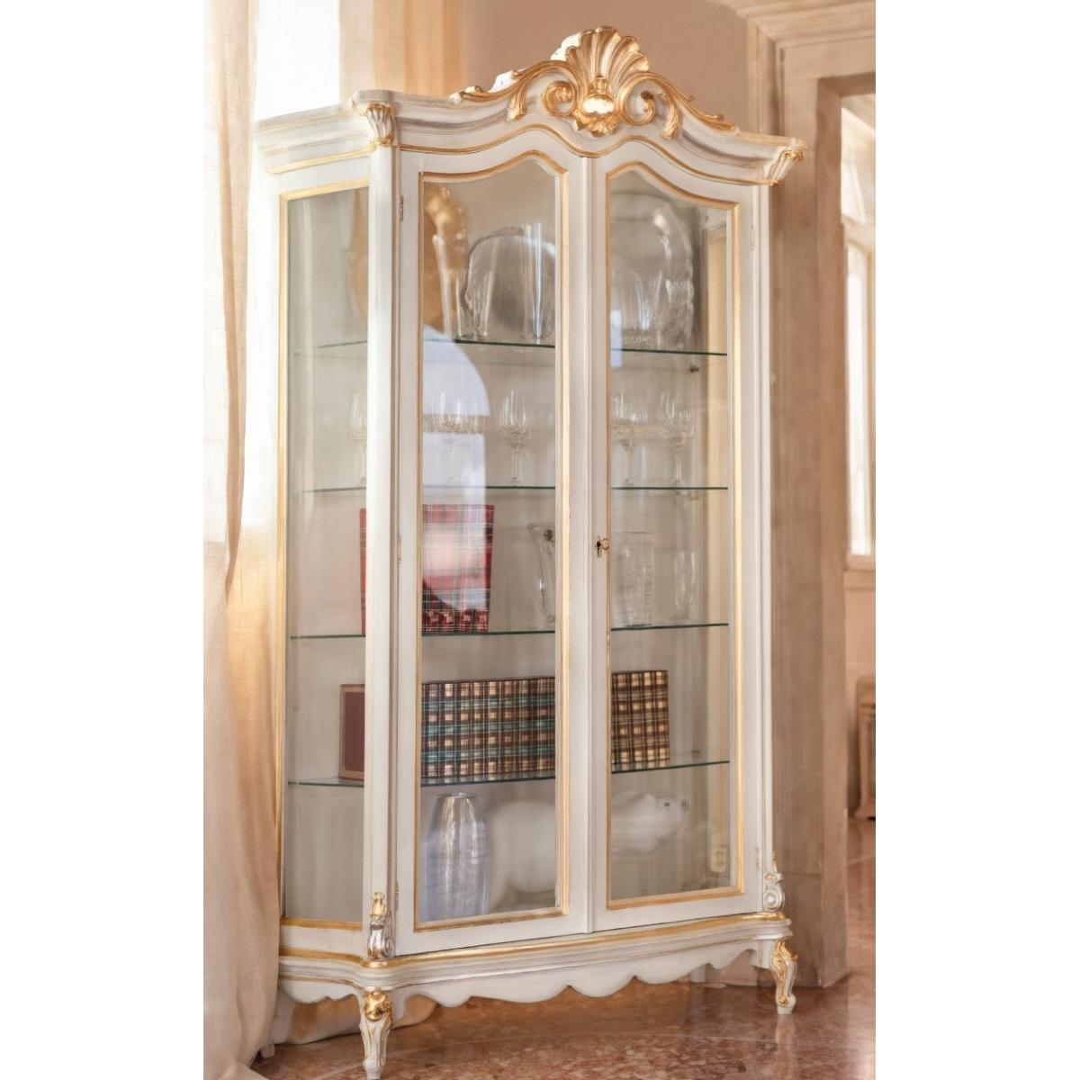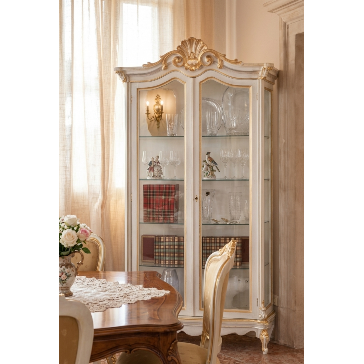 Luxury Ivory Baroque Double Door Glass Display Cabinet with Sculpted Crown Crest & Golden Trim Accents by Luxury Group International