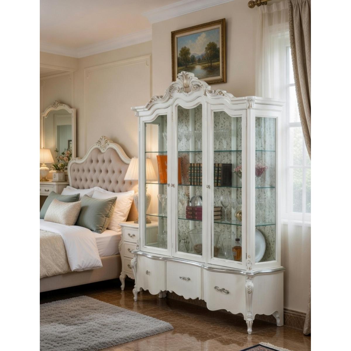 Luxury Ivory Baroque Three Door Glass Display Cabinet with Sculpted Crown Crest & Storage Console Base by Luxury Group International