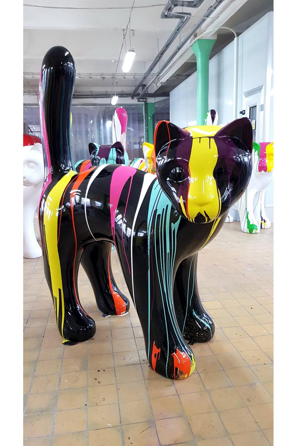 This expressive cat sculpture is a striking modern sculpture crafted to captivate attention, featuring a bold hand-applied color drip art finish that flows organically across the surface, transforming it into a vibrant large statue for luxury interiors, events, and contemporary art environments.