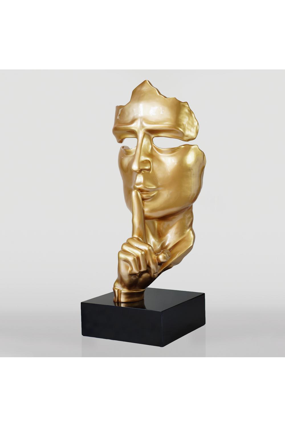 The Luxury Large Gold Mask Sculpture on Black Base embodies grandeur and refined artistry. Standing at an impressive 190 cm, this large sculpture depicts a golden face in a gesture of quiet introspection—symbolizing peace and mystery. Expertly handcrafted from high-quality PWS glass laminate, it features a lustrous metallic gold finish that contrasts beautifully against its deep black base, offering a powerful yet sophisticated visual balance.