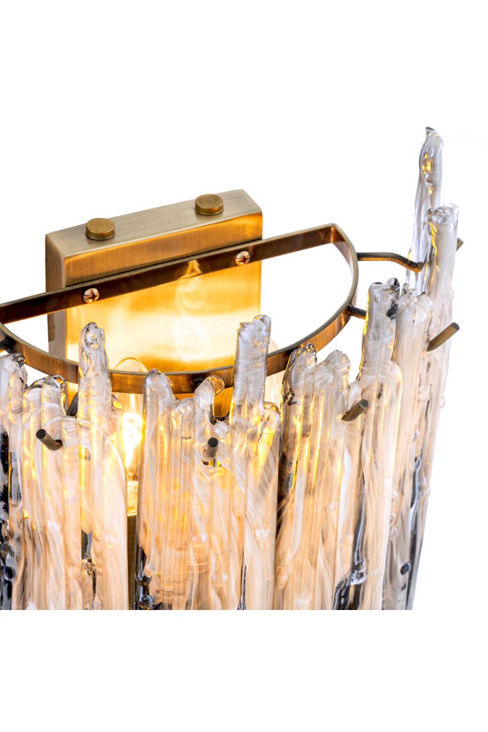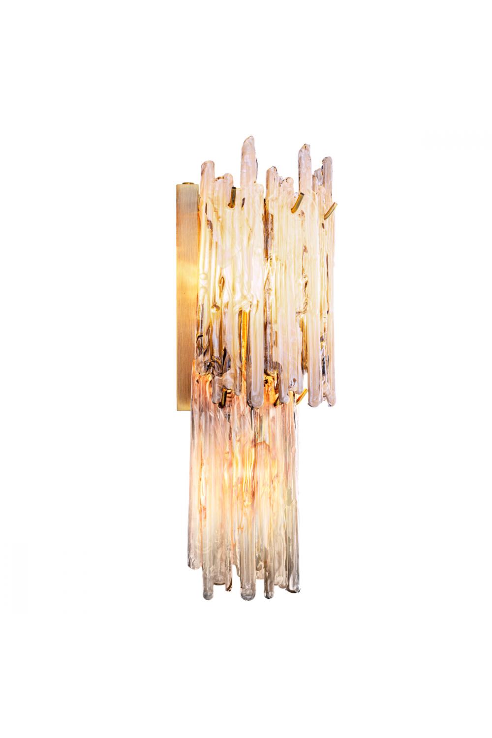 The warm metallic tone of the light brushed brass frame introduces a subtle glow, while the cascading smoke glass elements create depth, texture, and visual rhythm. Light filters gently through the glass layers, producing a soft, ambient illumination that enhances architectural surfaces without overwhelming the space. As a luxury wall lamp, it creates a calm yet dramatic presence, ideal for interiors that value balance and refinement.