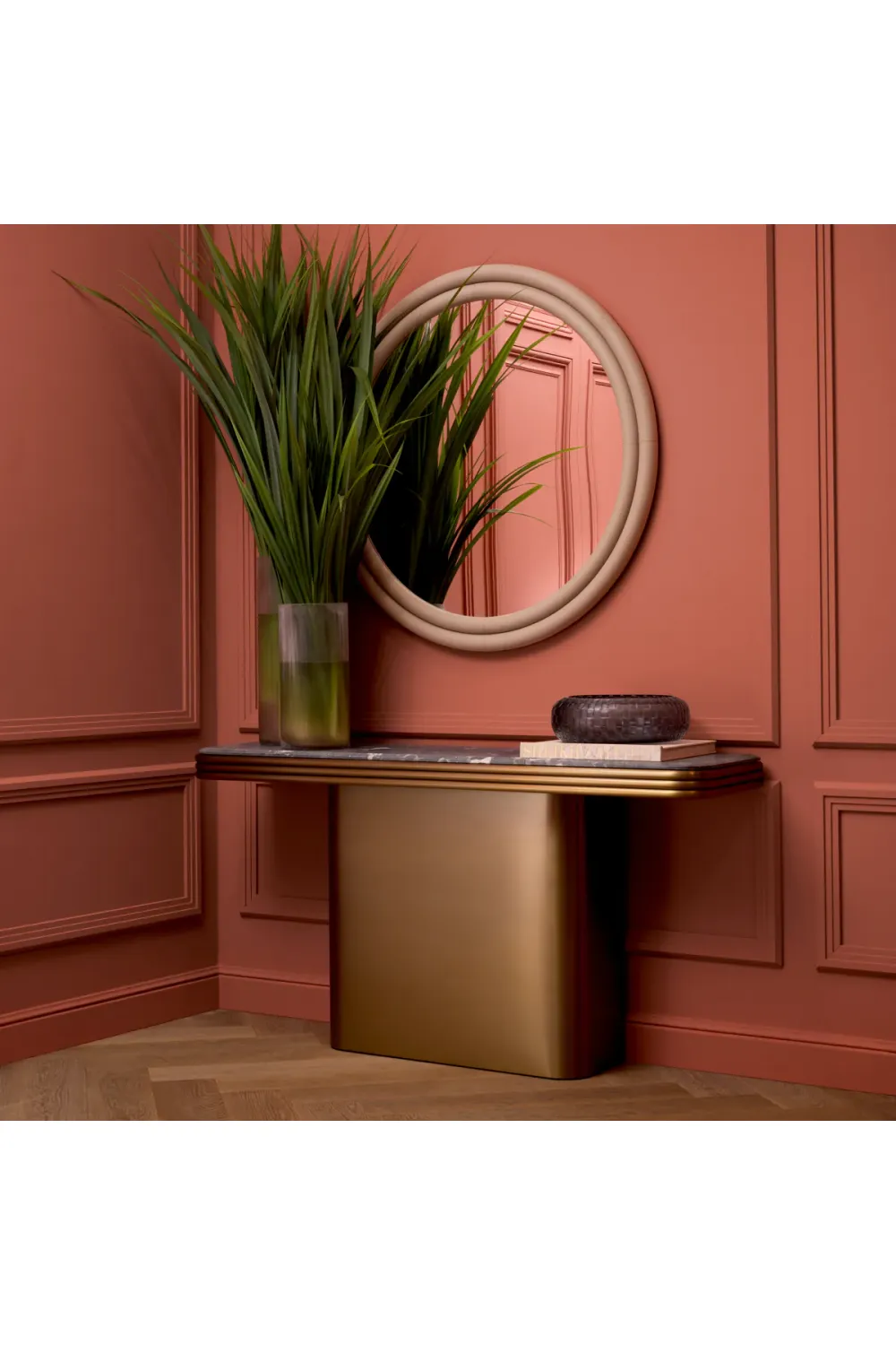 Perfect blend of modern minimalism and timeless round mirror architecture