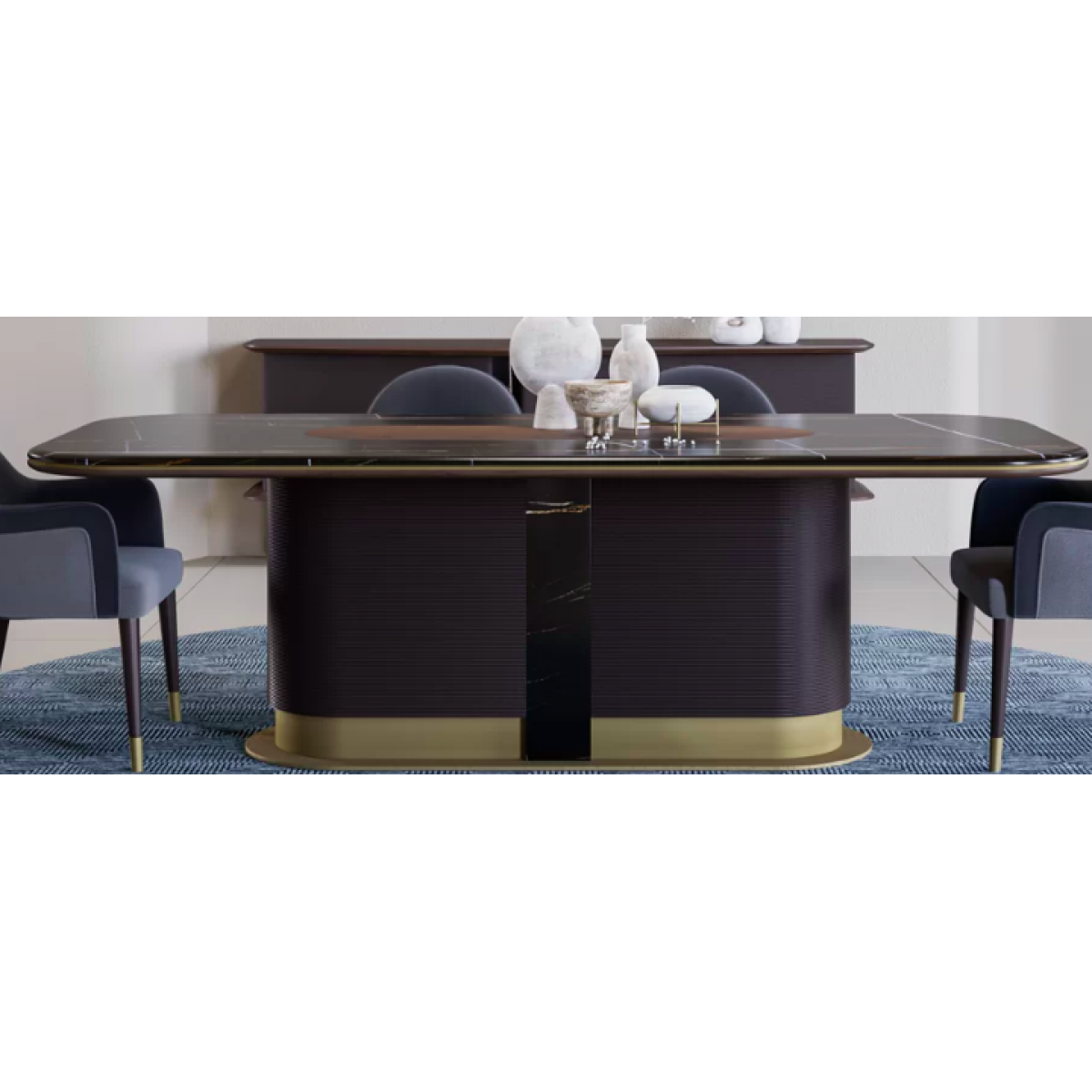 • Luxury marble top brass pedestal rectangular dark brown wooden dining table featuring elegant marble craftsmanship and sculptural pedestal design.