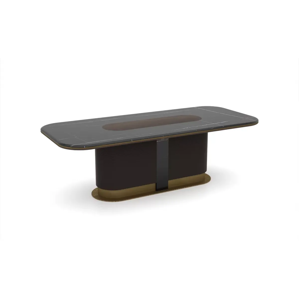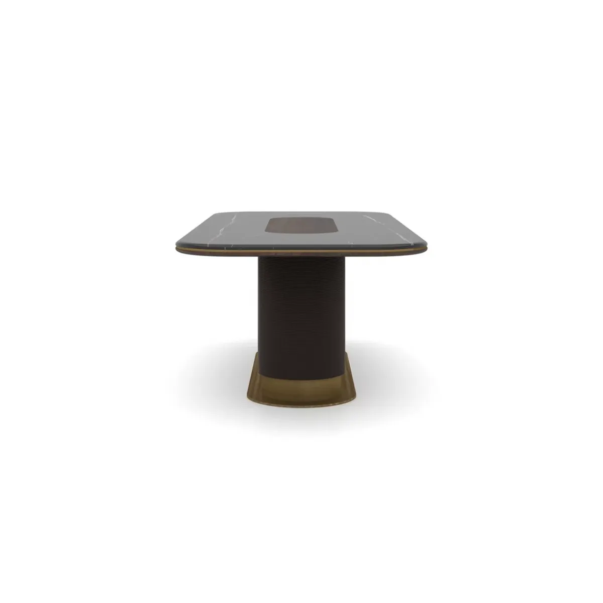 Luxury marble top antique brass pedestal rectangular dark brown wooden dining table designed with a refined marble surface and sculptural pedestal base. This sophisticated luxury dining table combines elegant brass detailing with premium wood craftsmanship, creating a statement marble top dining table ideal for modern European dining interiors.