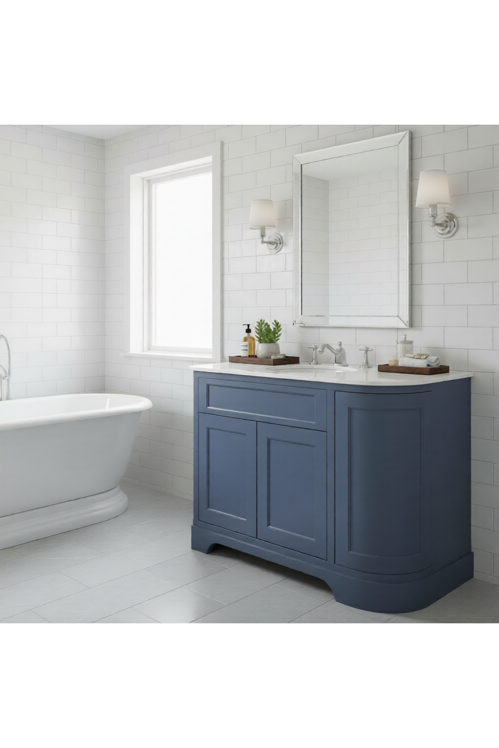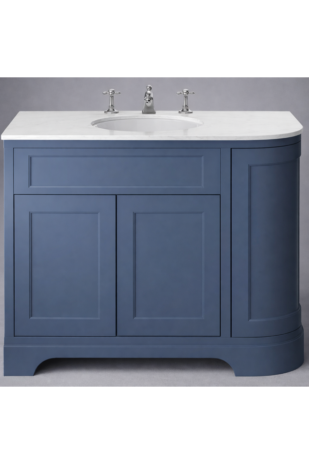 Refined and sculptural, this double door vanity unit features a distinctive left-hand curved profile, rich Maritime Blue finish, and an elegant white stone top. Crafted as a premium designer vanity unit, it delivers balanced storage and architectural sophistication for curated luxury vanities for bathroom interiors.