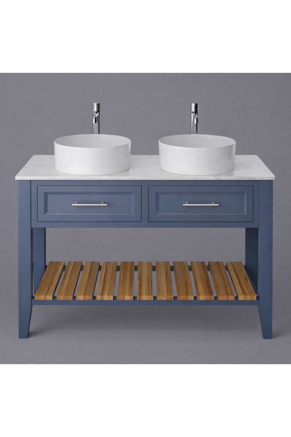 Luxury Maritime Blue Finish Double Basin Washstand with Two Drawers and Open Wood Storage Shelf – 120 CM