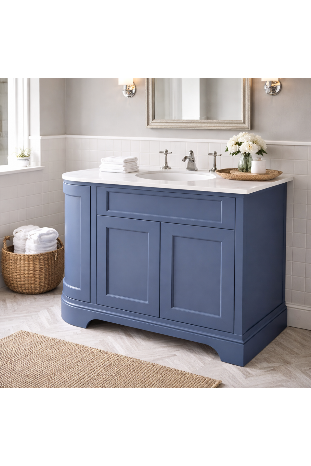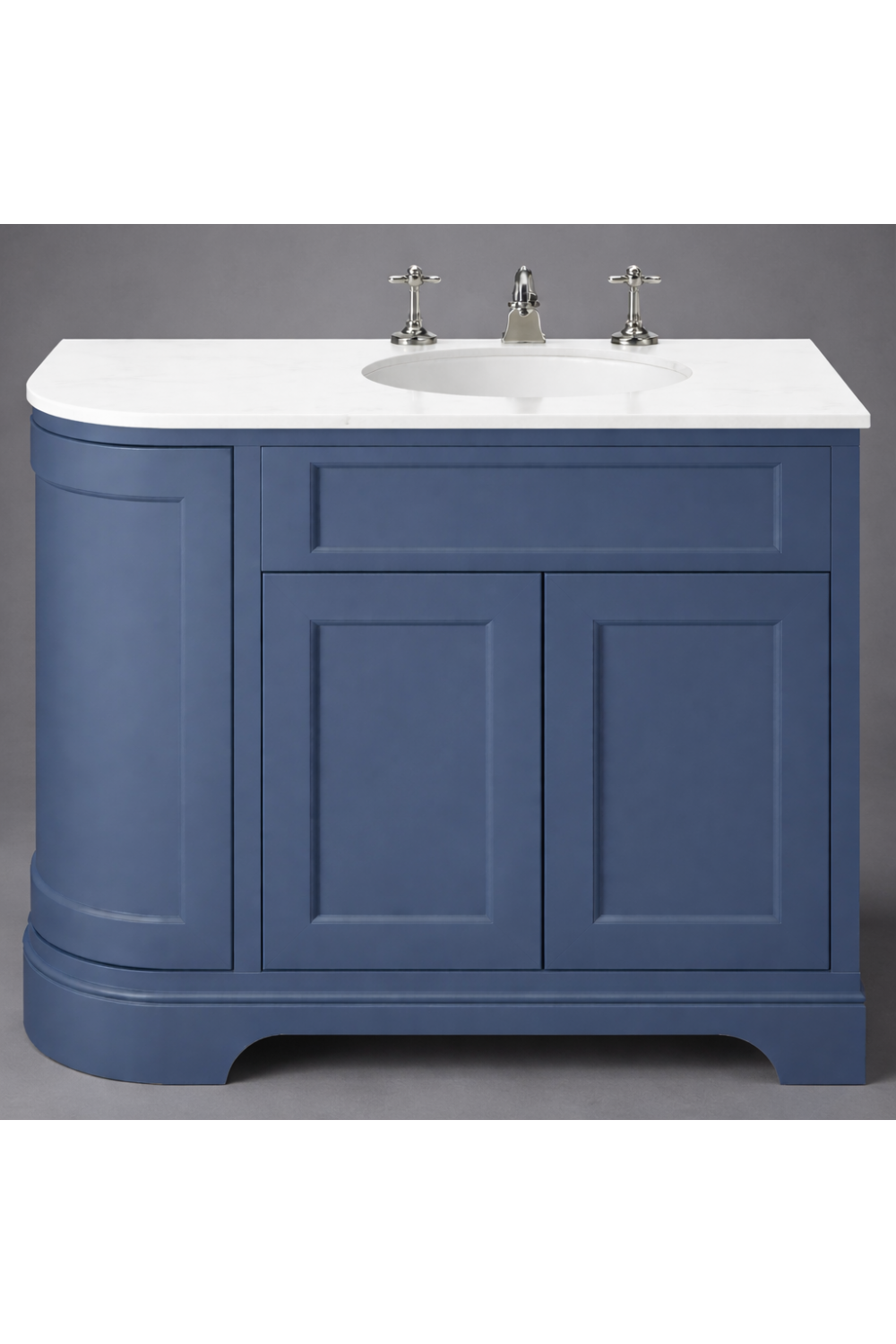 This refined double door vanity unit features a sculpted right-hand curved cabinet, deep Maritime Blue finish, and an elegant white stone top, delivering generous concealed storage and timeless craftsmanship as a sophisticated designer vanity unit for luxury European bathrooms.