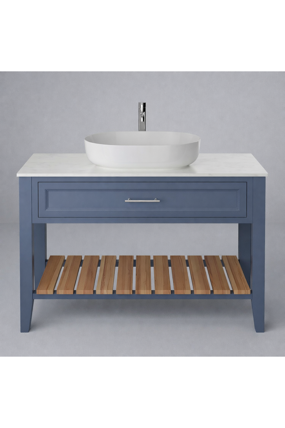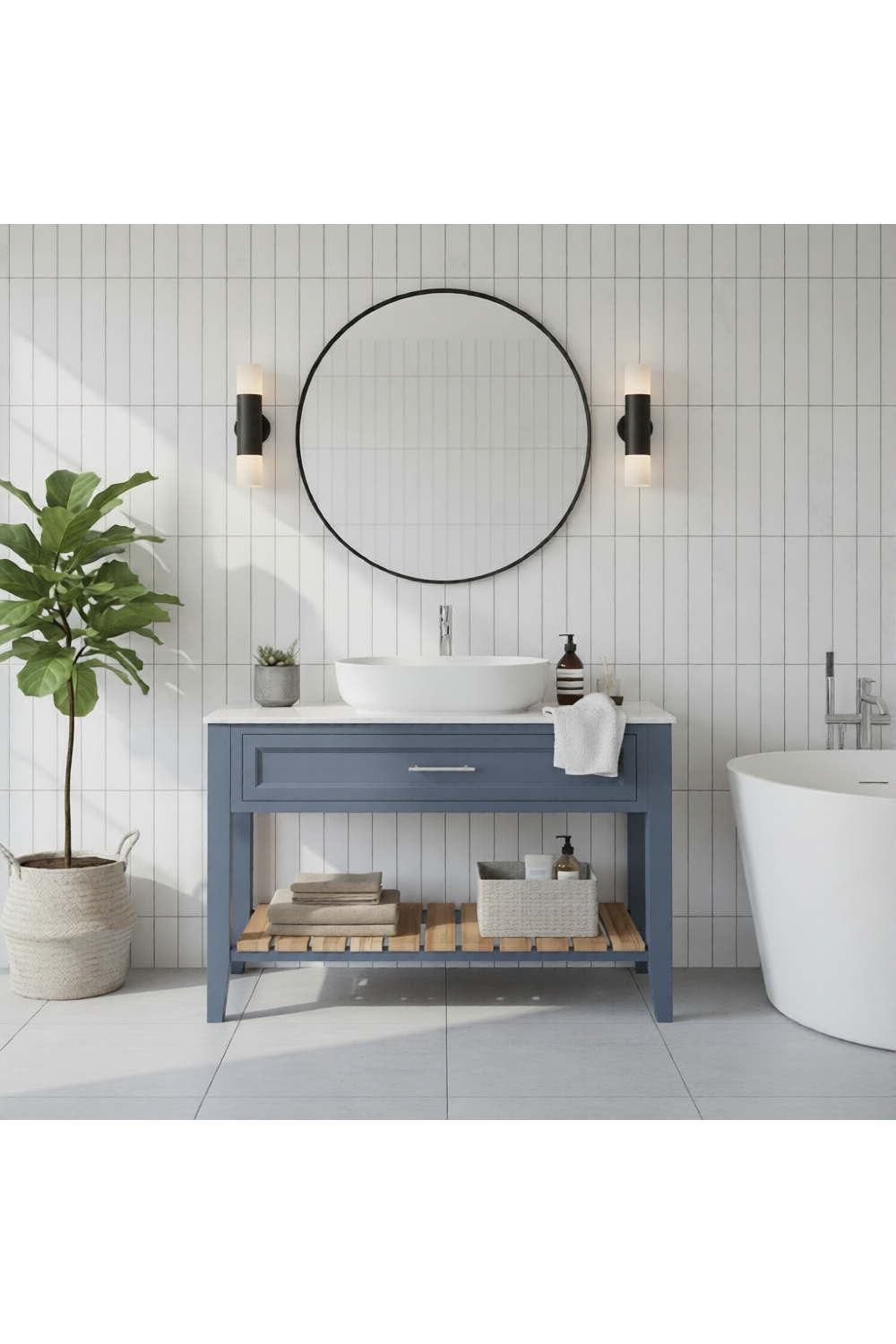 Luxury Maritime Blue Finish Single Basin Washstand with One Drawer and Open Wood Storage Shelf – 120 CM brings refined European craftsmanship to modern bathroom environments. Finished in a rich Maritime Blue tone, this single basin washstand features a generous surface designed to accommodate a statement basin while maintaining clean visual balance. The single drawer provides discreet storage for everyday essentials, while the open wood storage shelf beneath allows easy access to towels or accessories. Structured lines, precise detailing, and durable construction make this washstand ideal for luxury residential bathrooms and boutique hospitality spaces.