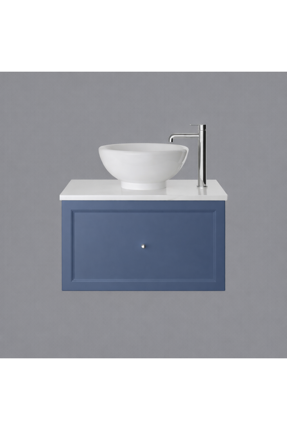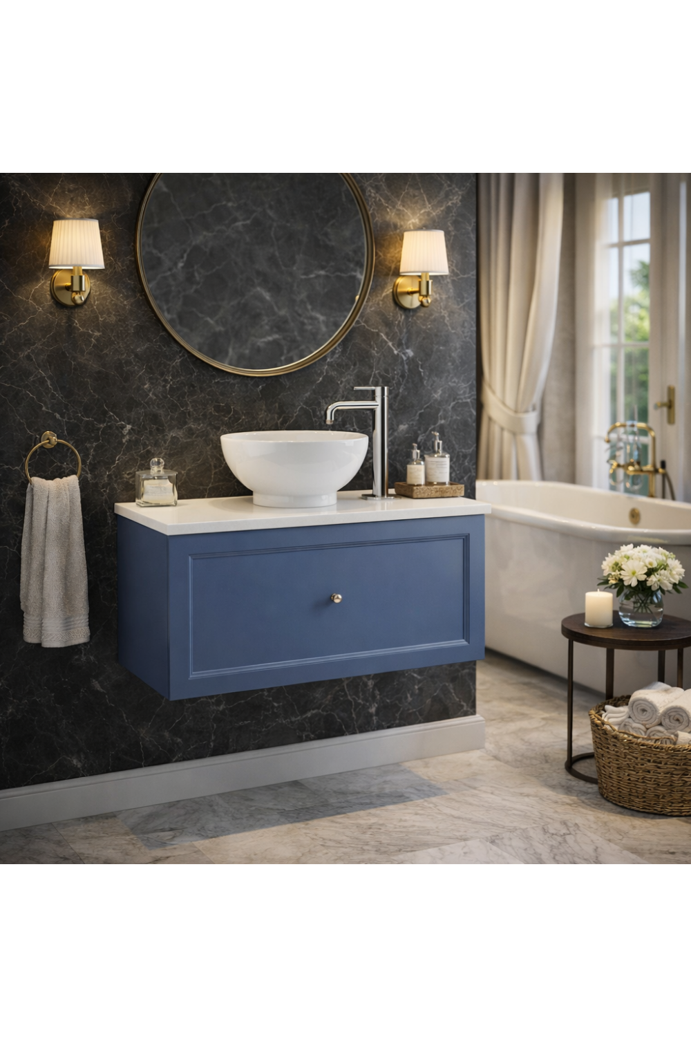 A refined wall hung one drawer vanity in an elegant Maritime Blue finish, created for contemporary European bathrooms. This designer one drawer vanity unit combines streamlined storage with enduring craftsmanship, making it a sophisticated choice among luxury vanities for bathroom interiors.