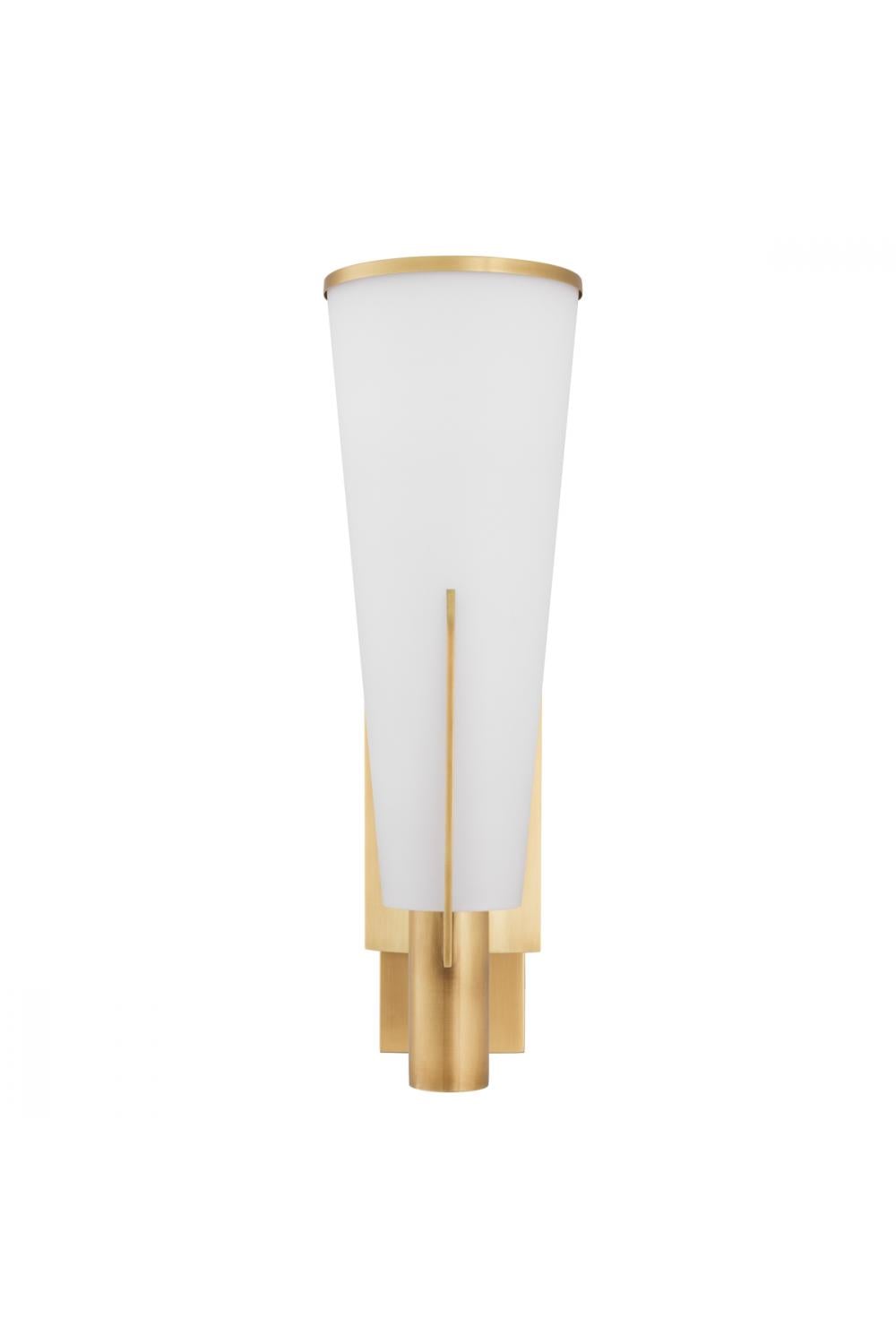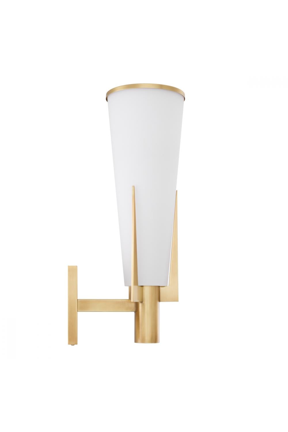 Luxury wall lamp crafted with a sculptural cone-shaped white glass shade that delivers soft, atmospheric illumination. This refined white glass wall lamp with metallic detailing elevates European interiors with timeless Mid-Century elegance.