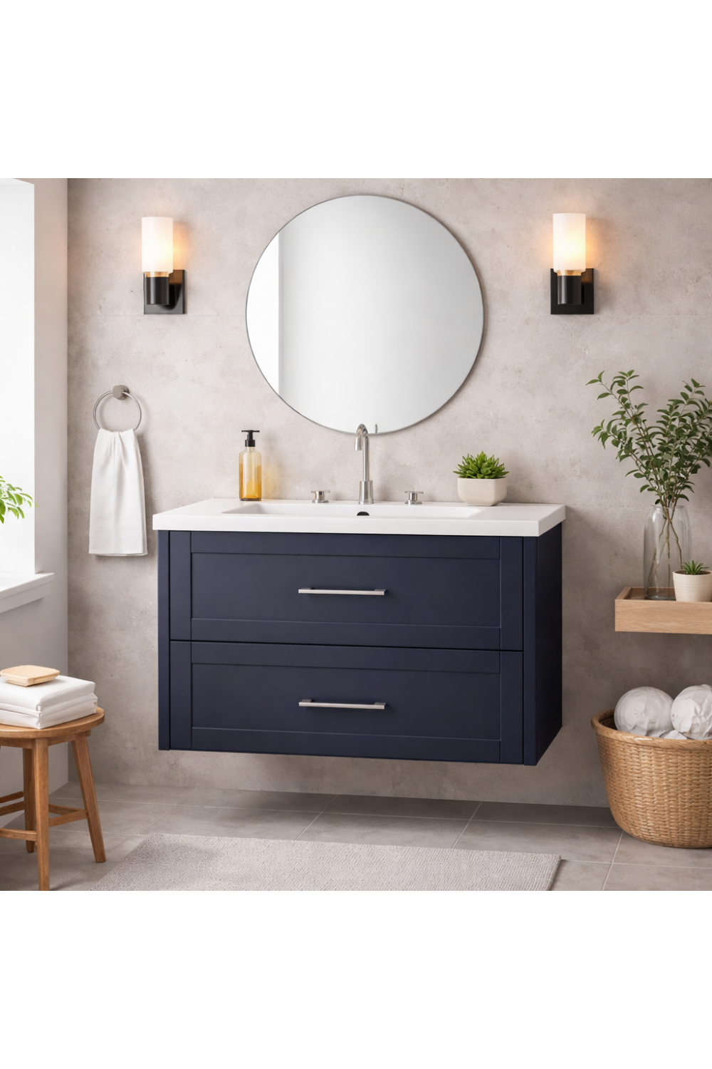 Luxury Midnight Blue Finish Wall Hung Two Drawer Vanity Unit – 80 CM is a sophisticated bathroom furnishing that blends contemporary aesthetics with practical functionality. Designed as a wall hung two drawer vanity unit, it creates a floating visual effect that enhances spatial openness while offering generous concealed storage. The deep Midnight Blue finish adds a bold yet refined character, making this designer two drawer vanity an ideal statement piece for modern European bathrooms seeking understated luxury and daily convenience.