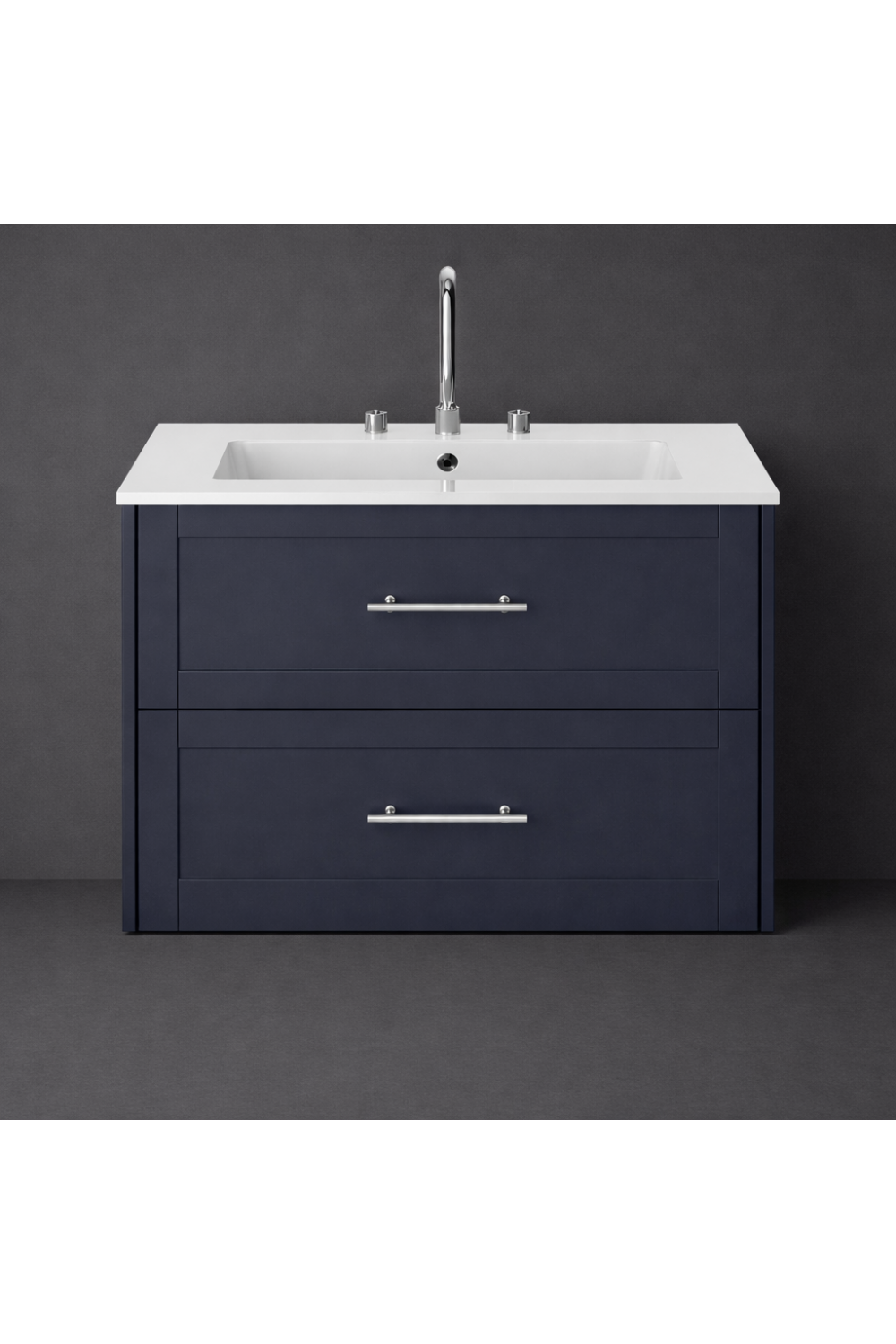 A refined wall hung two drawer vanity unit designed to elevate modern bathrooms with its rich Midnight Blue finish and clean architectural lines. This designer two drawer vanity delivers elegant storage while enhancing contemporary interiors with a premium, space-saving presence.