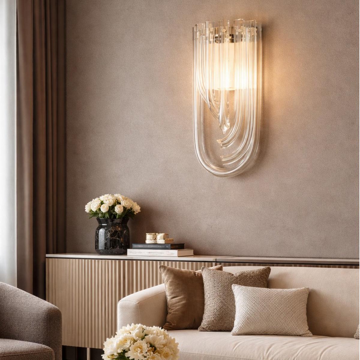 The Luxury Modern Curved Clear Glass Rod Wall Lamp for Elegant Living Room Lighting perfectly represents the harmony of modern design and decorative lighting. Each glass rod acts as a subtle diffuser, distributing illumination evenly while creating elegant reflections across surrounding surfaces. As a modern wall light and decorative accent, the fixture complements contemporary, Art-Deco, and luxury minimalist interiors. The sculptural silhouette of the curved glass rod wall light allows it to function as both lighting and wall décor, making it a preferred choice for luxury residences, boutique hotels, and refined hospitality environments.