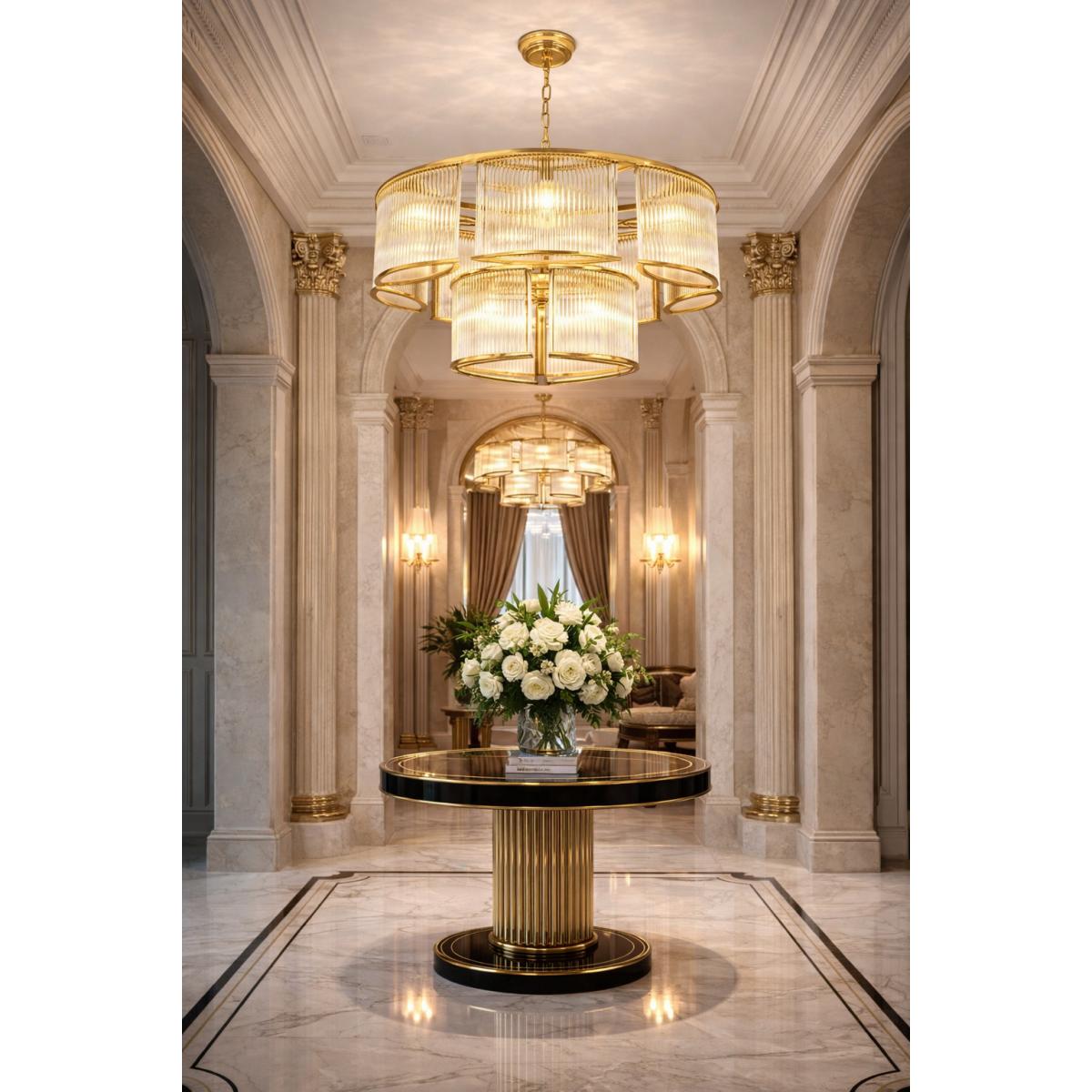 This luxury ribbed glass chandelier pairs beautifully with marble dining tables, velvet dining chairs, mirrored panels, and refined European décor. It is widely used in luxury residences, boutique hotels, and designer hospitality spaces featuring luxury hotel furniture.