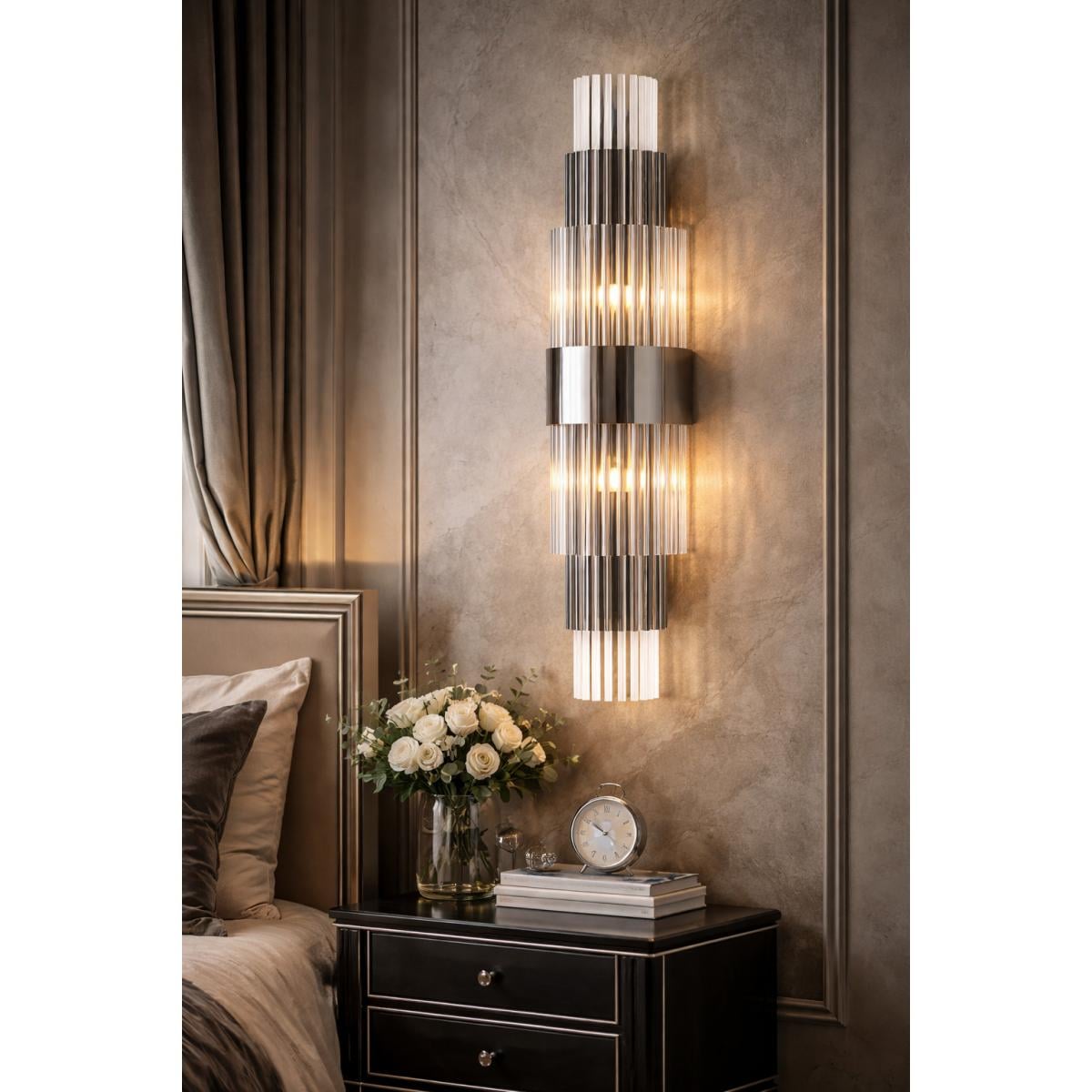 The title Luxury Modern Art Deco Vertical Ribbed Crystal Wall Lamp with Golden / Chrome Band – 80 CM reflects the core design language of the fixture. “Luxury Modern Art Deco” highlights the fusion of classic European Art Deco architecture with contemporary lighting elegance. “Vertical Ribbed Crystal” refers to the elongated crystal rods that create refined light diffusion, while the “Golden / Chrome Band” emphasizes the premium metallic accent that visually connects the upper and lower crystal layers. As a sophisticated Vertical Crystal Rod ribbed glass wall lamp and refined luxury gold / Chrome finish wall lamp, it enhances living rooms, hallways, bedroom feature walls, and boutique hotel interiors.