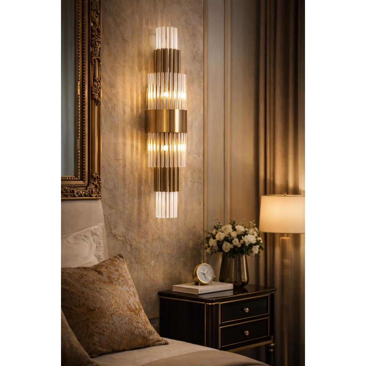 The title Luxury Modern Art Deco Vertical Ribbed Crystal Wall Lamp with Golden / Chrome Band – 80 CM reflects the core design language of the fixture. “Luxury Modern Art Deco” highlights the fusion of classic European Art Deco architecture with contemporary lighting elegance. “Vertical Ribbed Crystal” refers to the elongated crystal rods that create refined light diffusion, while the “Golden / Chrome Band” emphasizes the premium metallic accent that visually connects the upper and lower crystal layers. As a sophisticated Vertical Crystal Rod ribbed glass wall lamp and refined luxury gold / Chrome finish wall lamp, it enhances living rooms, hallways, bedroom feature walls, and boutique hotel interiors.