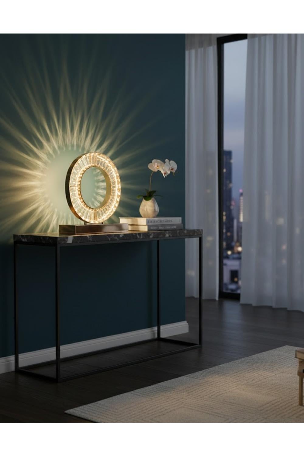 Luxury Modern Crystal LED Table Lamp blends geometric simplicity with high-end materials to create a striking visual appeal. Designed in a captivating Ring or Halo silhouette, this table lamp serves not just as a light source, but as a sculptural statement piece. The lamp features a circular arrangement of sparkling faceted crystals, encased within a polished gold or brass-finished metal frame. Integrated LED strips nestled inside the frame provide a refractive glow that shimmers through the crystals, casting beautiful light and creating a luxurious ambiance.