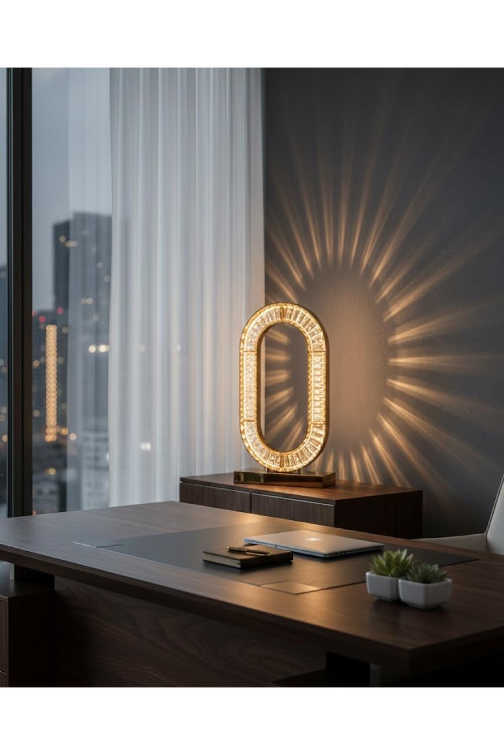 The Luxury Modern Crystal LED Table Lamp with Circular (Ring) is a masterpiece of modern design. Featuring a bold circular (halo) silhouette, this lamp is an elevated statement piece for any luxurious setting. The high-shine polished gold or rose gold base complements the elegant metal frame, which holds precision-cut faceted crystals. Integrated LED strips inside the frame shine through these crystals, creating a beautiful shimmering effect and casting soft, radial light patterns that illuminate your space with a soft, luxurious glow.