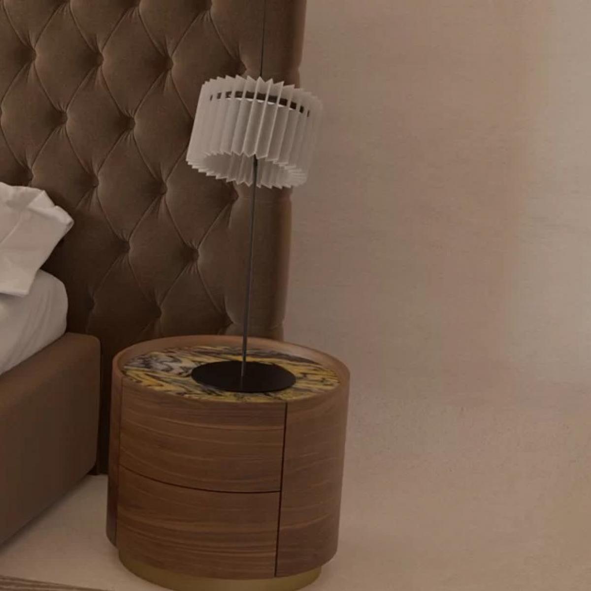 Perfectly suited for bedroom nightstands, hotel suite bedside tables, or accent furniture in designer apartments, this modern round brown oak veneer wooden nightstand caters to those who appreciate sophisticated style and practical storage. This luxury nightstand enhances any modern luxury interior with its timeless design and premium materials. Explore our luxury hotel furniture collection to complement this exquisite piece and discover other refined furnishings like luxury chandeliers and coffee tables that elevate your living spaces. Explore similar options in our Luxury Nightstand Collection. Pairs seamlessly with the King Size Dark Brown Tufted Upholstered Hotel Bed with Headboard to create a refined and cohesive luxury bedroom setting.