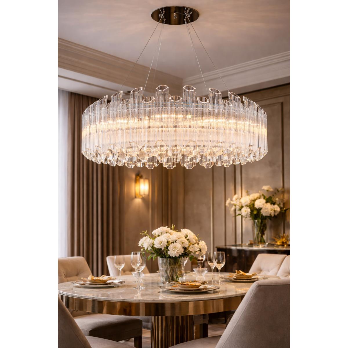 • Luxury chandelier crafted with precision-cut vertical crystal rods creating radiant reflections