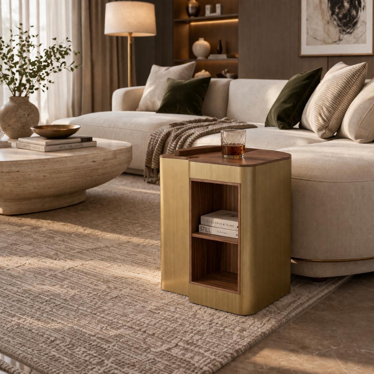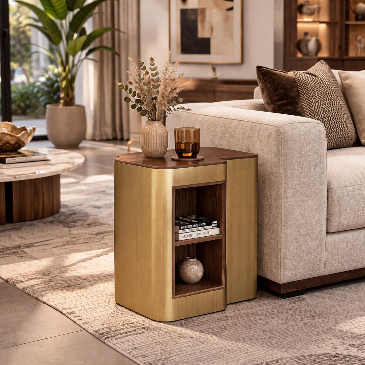 Styled as a sofa side table, it works beautifully beside a sofa or bed where you want storage and display in one compact footprint. Use the tabletop for a lamp, framed photo, or decor styling, and place frequently used items in the open compartment for quick access. The recessed front opening supports an uncluttered visual rhythm, while the brushed finish adds depth and warmth that complements both neutral and bold interiors. If you’re seeking a modern end-table solution with standout contrast and refined craftsmanship, this brushed gold and dark brown piece is a versatile choice for everyday living and elevated presentation. Explore our luxury side table collection to discover sophisticated designs that bring elegance, storage, and functionality to modern living spaces.