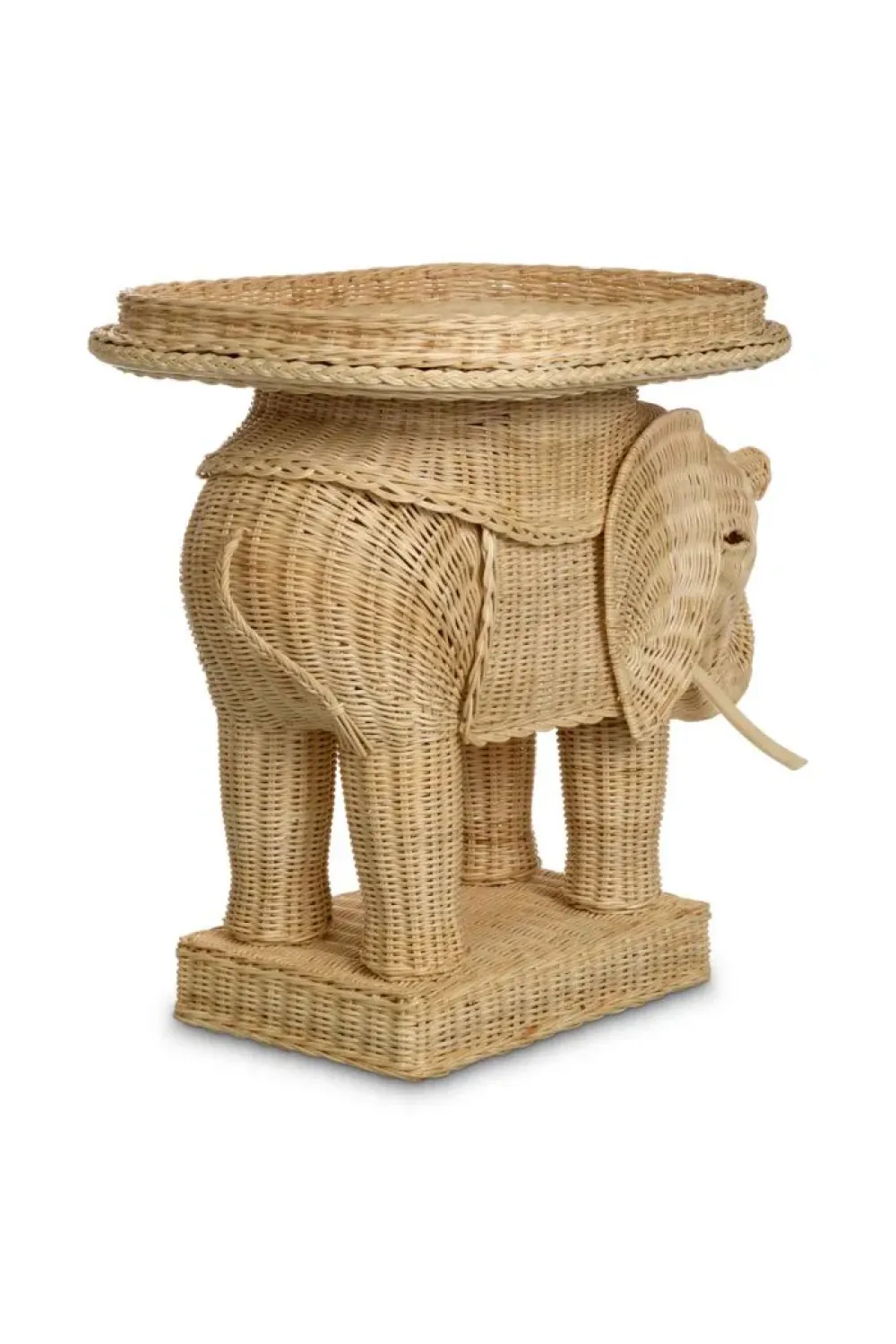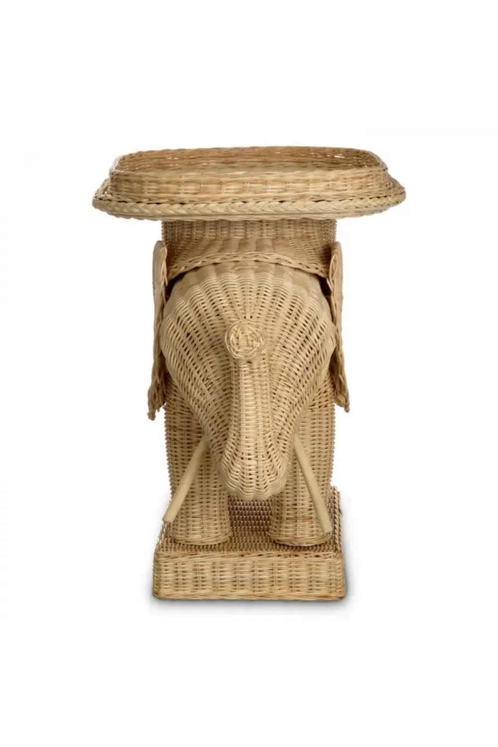 Natural rattan side table in elephant shape crafted as a sculptural accent for luxury interiors. Handwoven natural rattan highlights artisanal craftsmanship and organic texture. A charming yet refined statement that elevates curated living spaces. Functions effortlessly as a luxury side table with character. Perfect for sophisticated interiors seeking playful elegance.