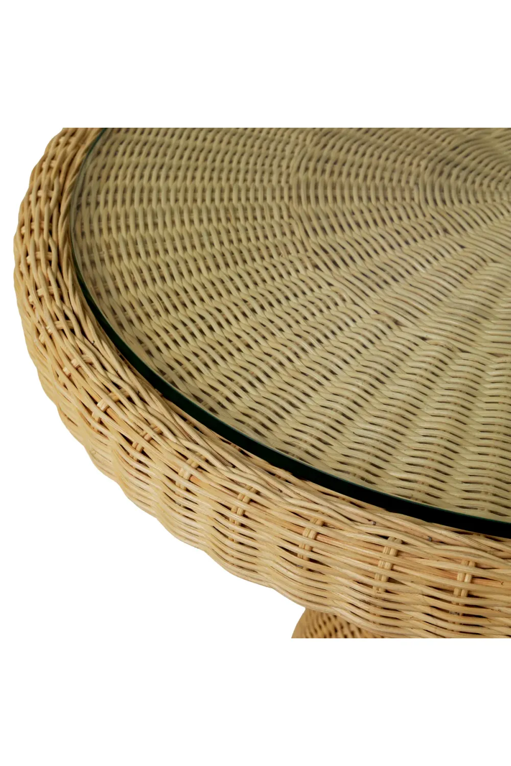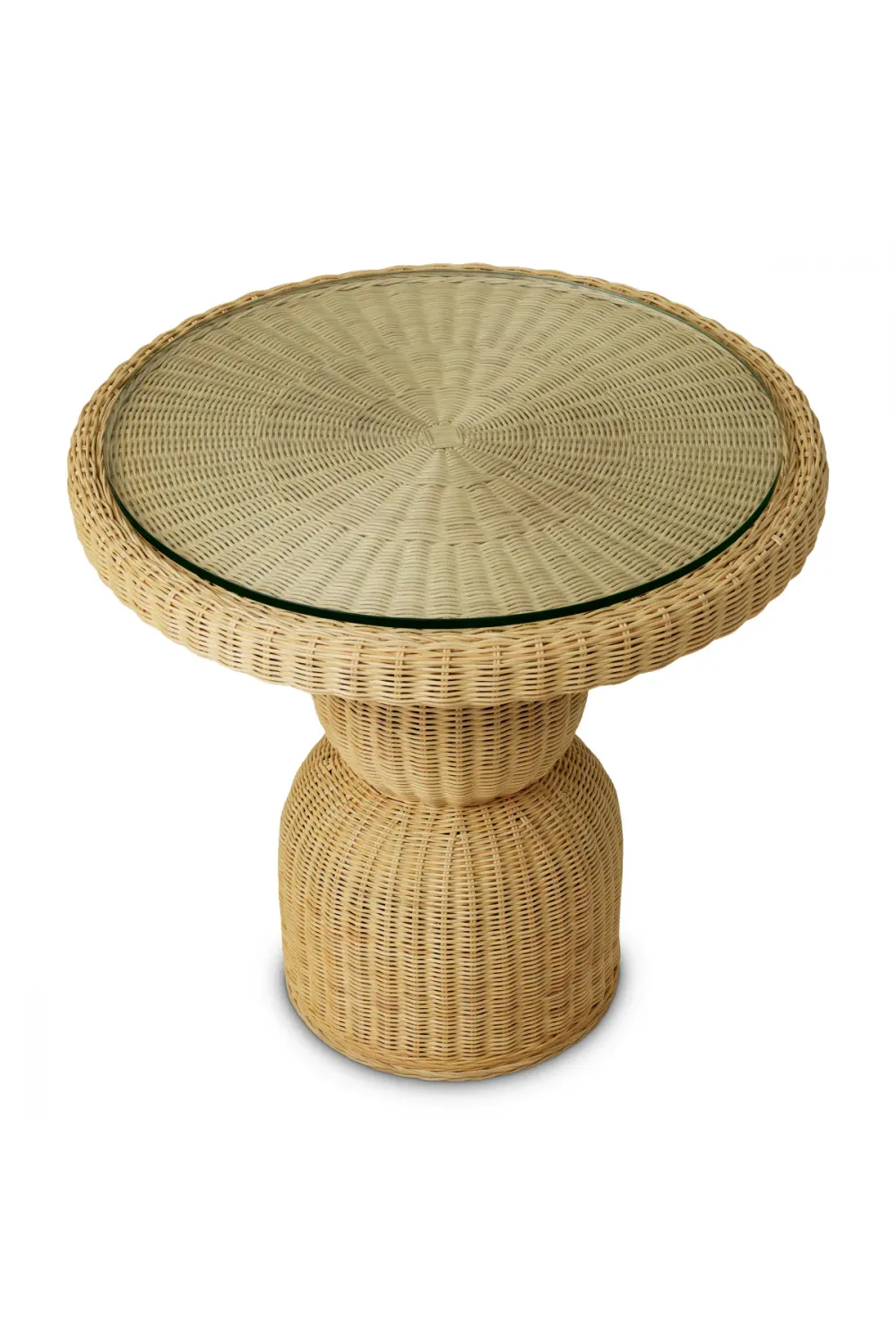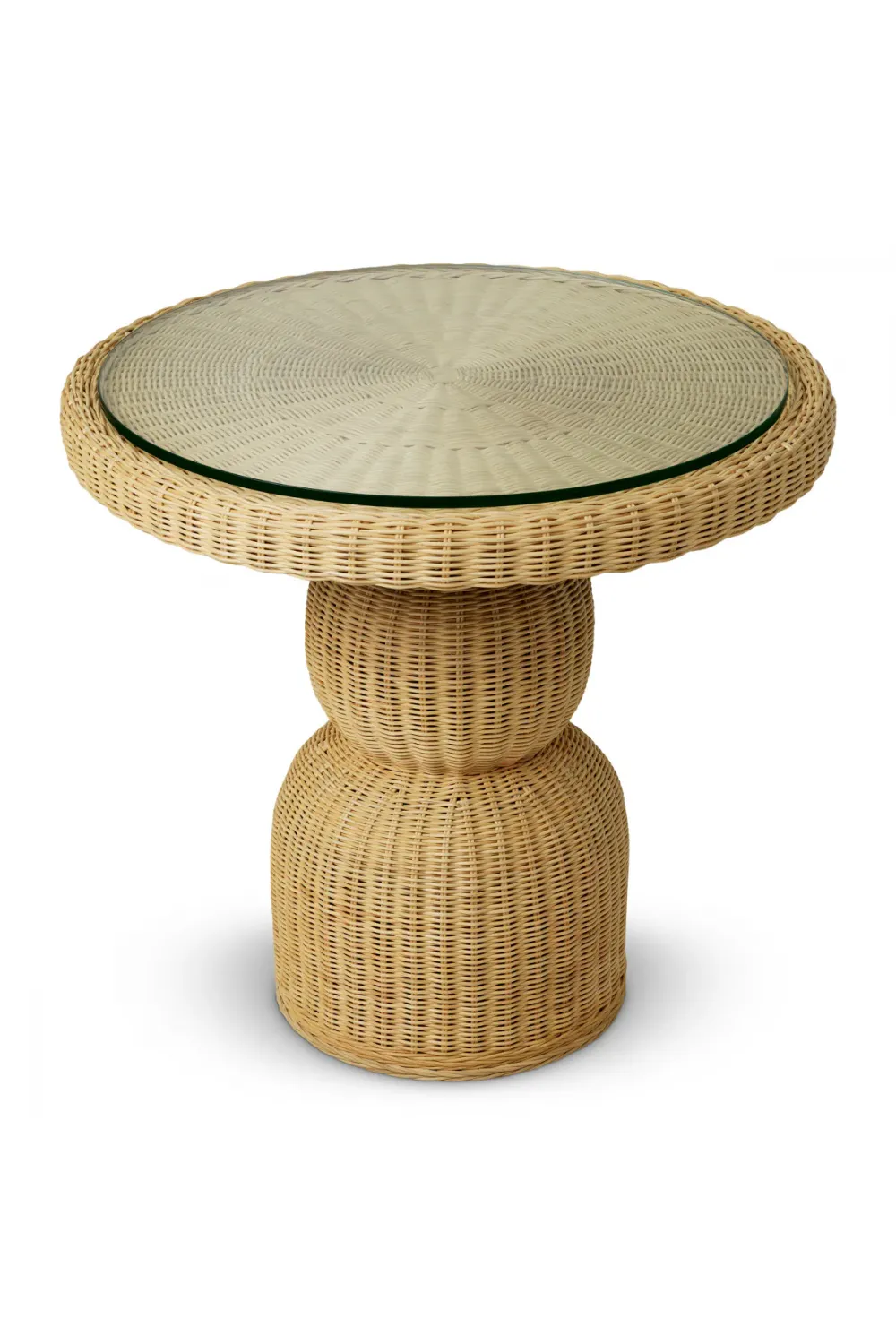 The round silhouette is crowned with a sleek glass surface, allowing the intricate rattan detailing to remain visible while offering a smooth and practical dining top. Perfectly proportioned for intimate dining, bistro-style settings, or refined lounge spaces, this Luxury dining table delivers both function and understated elegance.
