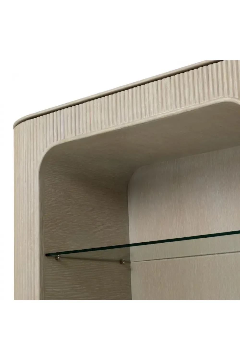 This off white wooden cabinet with glass rack is finished in washed oak veneer, presenting a light, natural tone that enhances its vertical form. Solid wood panels form a ribbed façade, creating visual rhythm and texture, while tempered glass shelves allow curated objects to be displayed with understated sophistication.