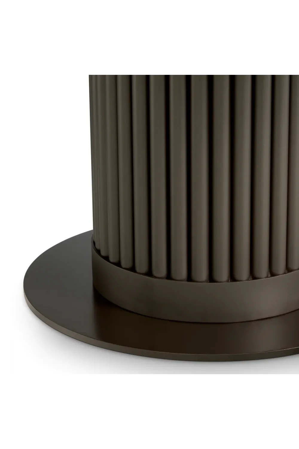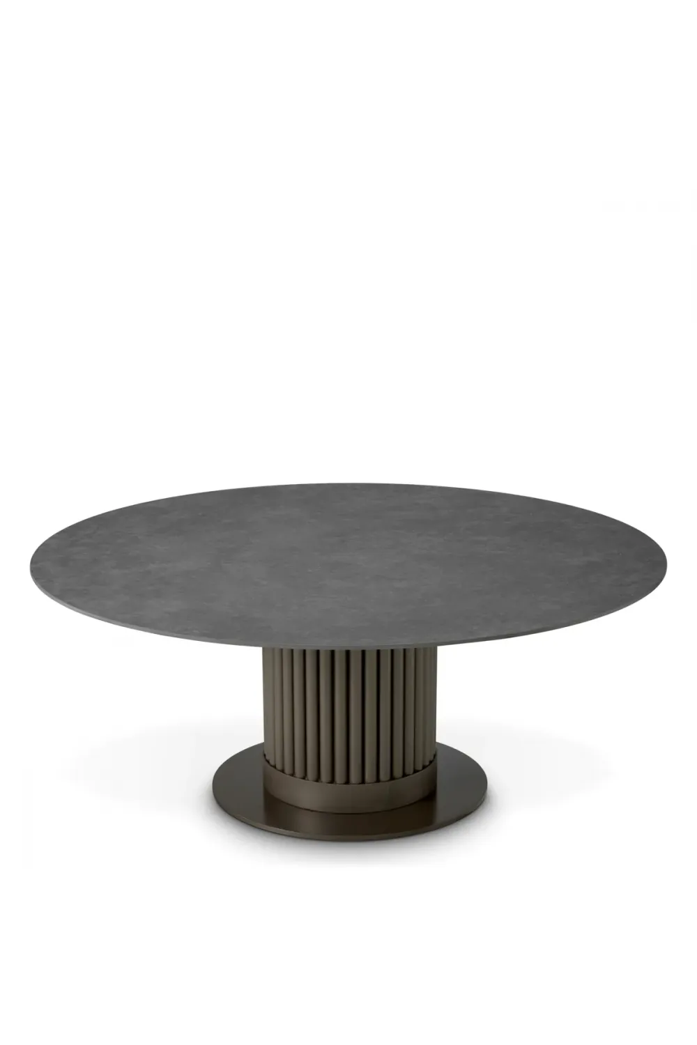 The table features a grey ceramic top, combining the natural charm of stone with the superior resilience of engineered material. Resistant to stains, scratches, and weather, it ensures enduring beauty that stands the test of time. The bronze-finished base adds a touch of warm opulence, creating a captivating contrast against the smooth, cool surface of the tabletop.
