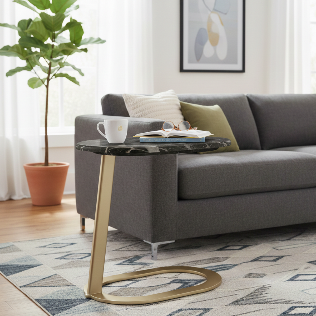 The Luxury oval Brushed brass finish marble top black/white C shaped sofa side table design embodies refined European craftsmanship and contemporary elegance. Its smooth oval marble top, offered in striking black or luminous white, highlights the organic veining that makes each surface entirely unique. Supported by a streamlined stainless steel structure in brushed brass finish, the sculptural pedestal base creates a harmonious balance between strength and visual lightness. Designed for stability and everyday functionality, this piece supports up to 20 kg while maintaining a sleek architectural presence. The Luxury oval Brushed brass finish marble top black/white table is both a functional accent and a sculptural statement.