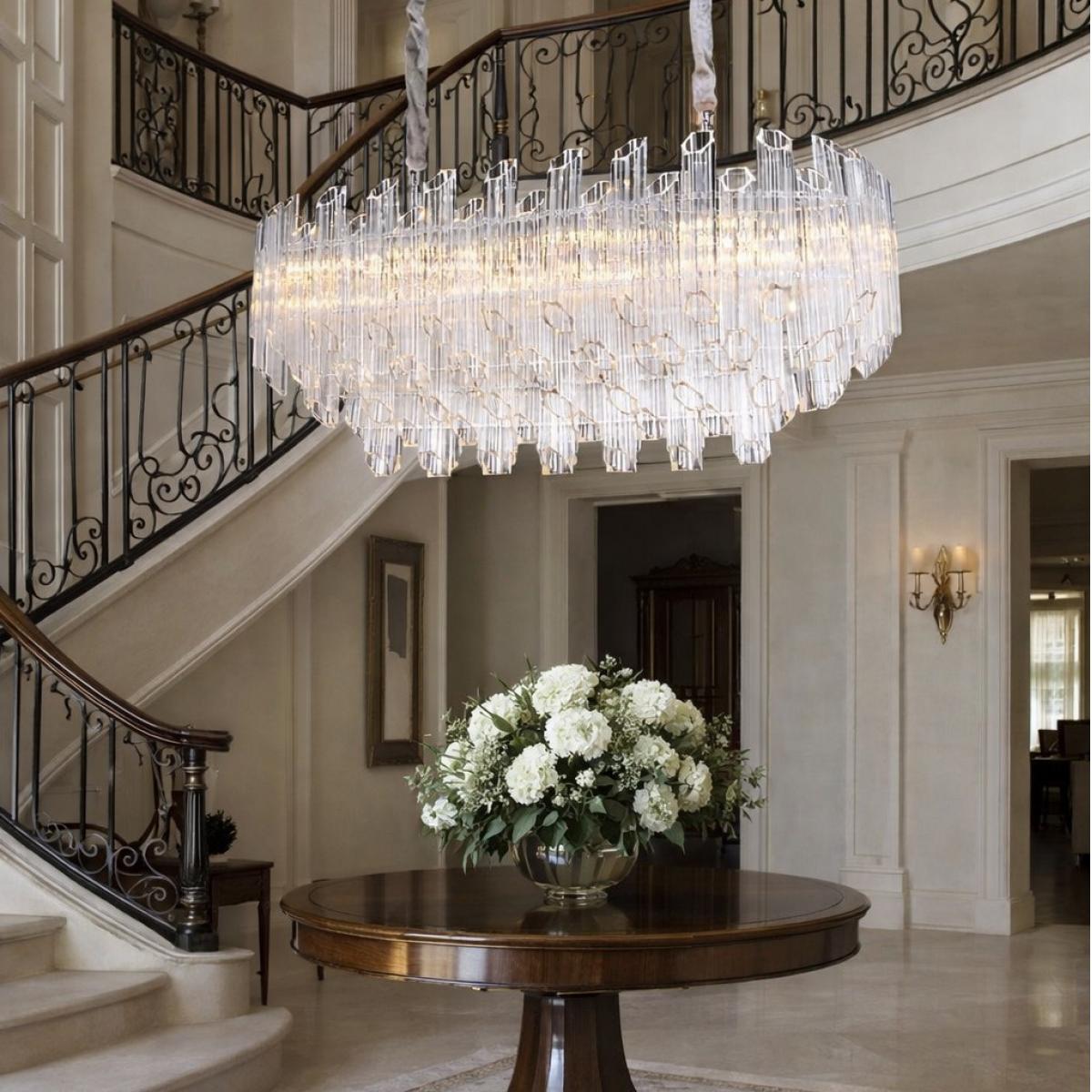With a design that incorporates high-quality crystal chandeliers and glass rod modern chandeliers, this piece enhances any room, offering both function and beauty. Its intricate crystal rods form a tiered, oval shape, adding depth and visual interest. This modern chandelier is perfect for homeowners looking to invest in a lighting fixture that combines beauty and practicality. The reflective qualities of the crystal material ensure that the light radiates in a soft, ethereal glow, perfect for dining rooms, living rooms, or even hotel lobbies.
